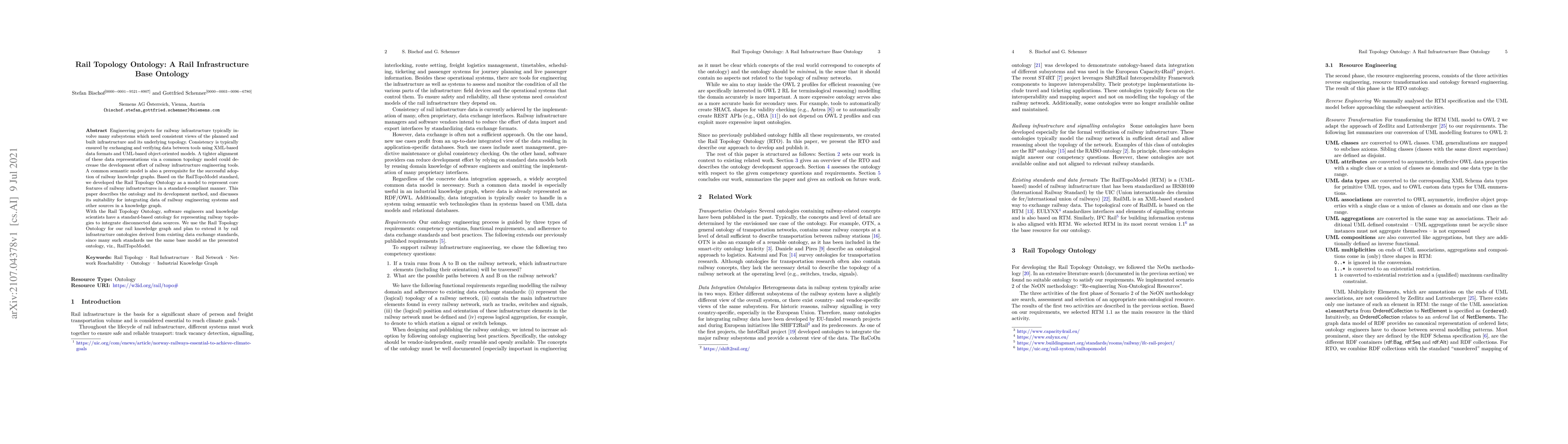 The Rail Topology Ontology standardizes the representation of railway infrastructure features, aiming to integrate diverse data sources into a knowledge graph. Developed based on the RailTopoModel standard, it facilitates the alignment of XML-based data formats and UML models, reducing engineering tool development efforts.