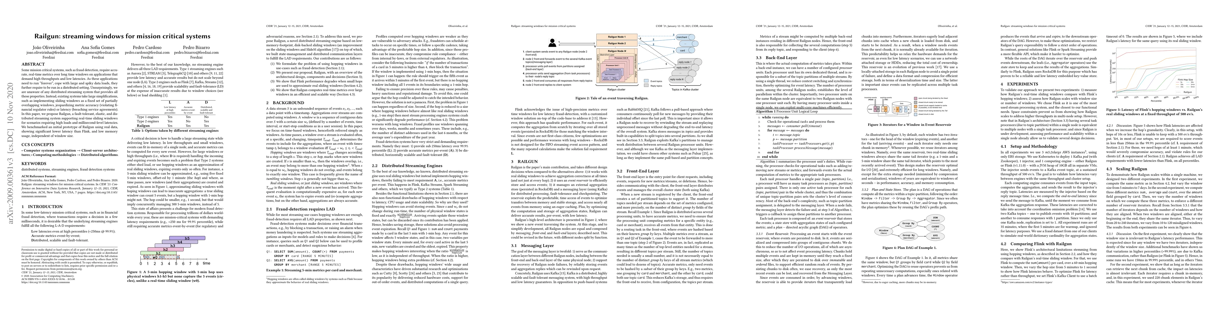 Title: Railgun: streaming windows for mission critical systems Summary: This paper introduces Railgun, a distributed streaming system designed to handle high-throughput, low-latency requirements for mission-critical applications like fraud detection, by providing accurate real-time metrics over long time windows without compromising on fault tolerance and elasticity. Initial benchmarks show Railgun achieving lower latency and lower memory usage compared to Flink.