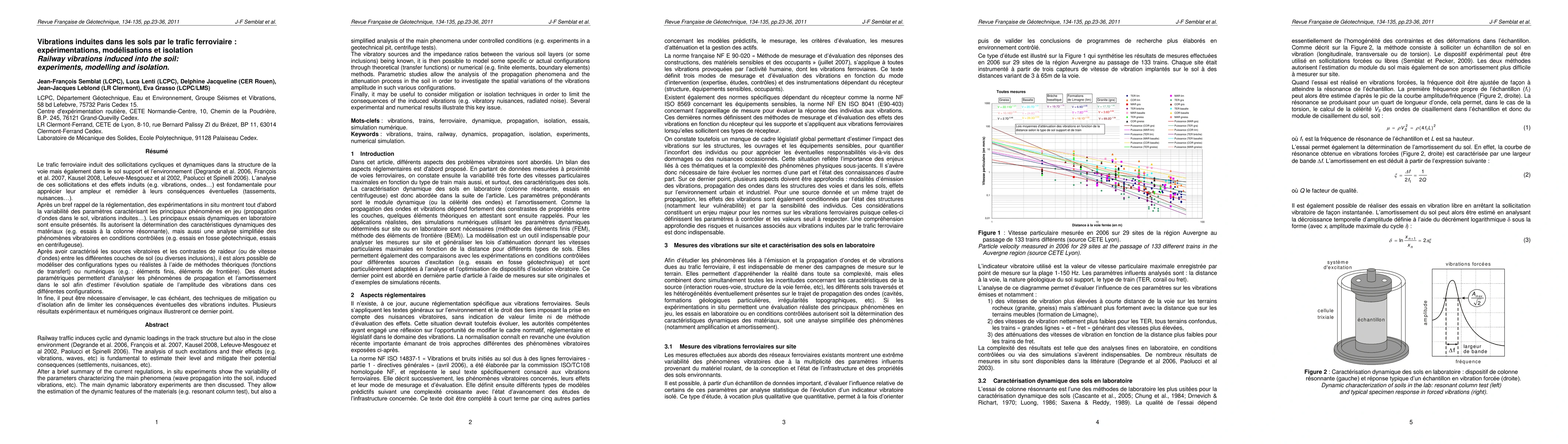 This paper investigates railway-induced vibrations in soil through experiments, modeling, and isolation techniques. It combines in situ and laboratory tests to analyze wave propagation and dynamic material features, followed by theoretical and numerical modeling to study vibration attenuation. Mitigation strategies are proposed to limit nuisances from induced vibrations.