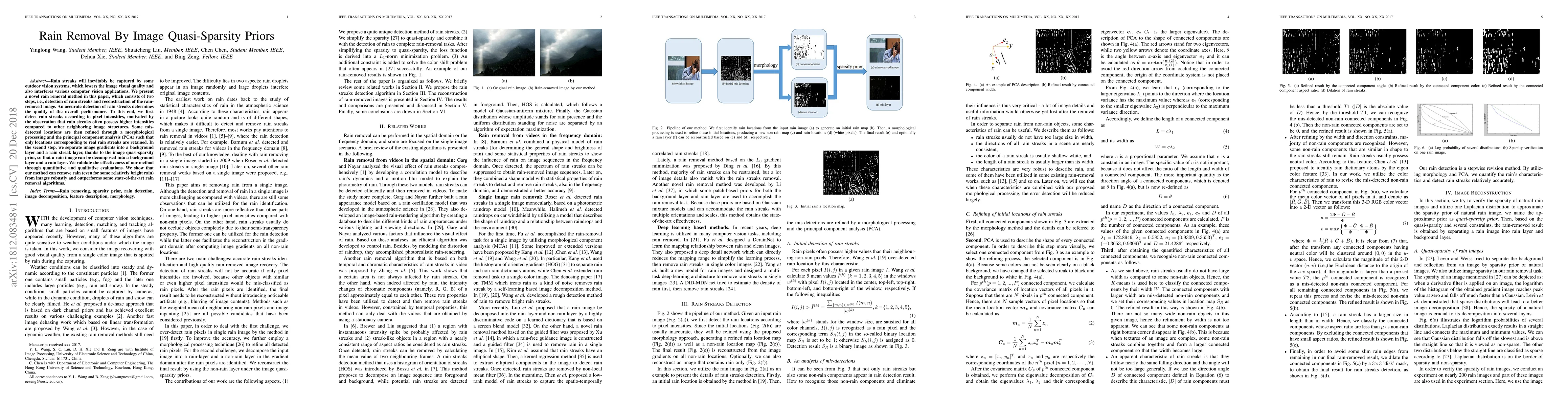 This paper proposes a novel rain removal method involving two steps: detecting rain streaks based on pixel intensity differences and refining detections using morphological processing and PCA, followed by reconstructing a rain-free image by separating image gradients into background and rain layers using quasi-sparsity priors. The method outperforms existing algorithms in both quantitative and qualitative evaluations.