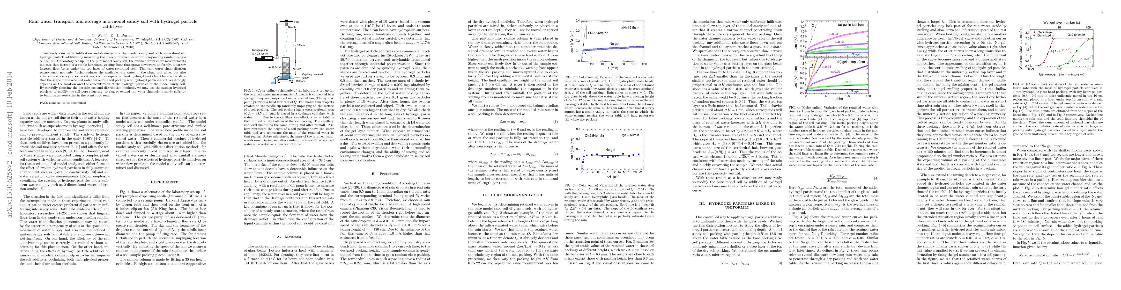 We study rain water infiltration and drainage in a dry model sandy soil with superabsorbent hydrogel particle additives by measuring the mass of retained water for non-ponding rainfall using a self-built 3D laboratory set-up. In the pure model sandy soil, the retained water curve measurements indicate that instead of a stable horizontal wetting front that grows downward uniformly, a narrow fingered flow forms under the top layer of water-saturated soil. This rain water channelization phenomenon not only further reduces the available rain water in the plant root zone, but also affects the efficiency of soil additives, such as superabsorbent hydrogel particles. Our studies show that the shape of the retained water curve for a soil packing with hydrogel particle additives strongly depends on the location and the concentration of the hydrogel particles in the model sandy soil. By carefully choosing the particle size and distribution methods, we may use the swollen hydrogel particles to modify the soil pore structure, to clog or extend the water channels in sandy soils, or to build water reservoirs in the plant root zone.