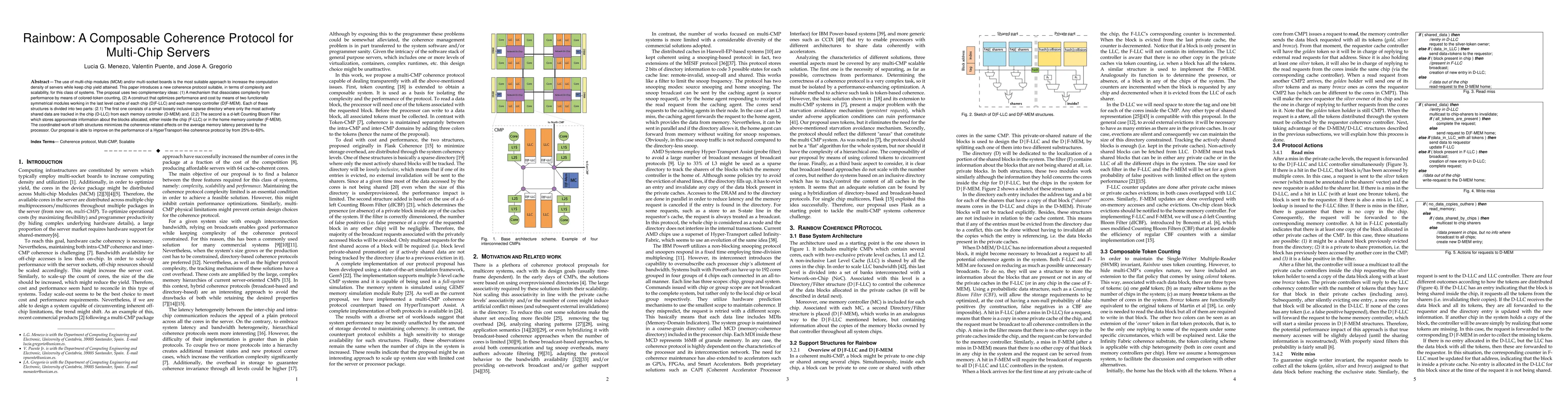 Title: Rainbow: A Composable Coherence Protocol for Multi-Chip Servers Summary: This paper proposes Rainbow, a scalable and complex-efficient coherence protocol for multi-chip servers, using colored-token counting and dual-module structures to optimize performance and reduce memory latency, achieving 25%-60% better performance than HyperTransport-like protocols.
