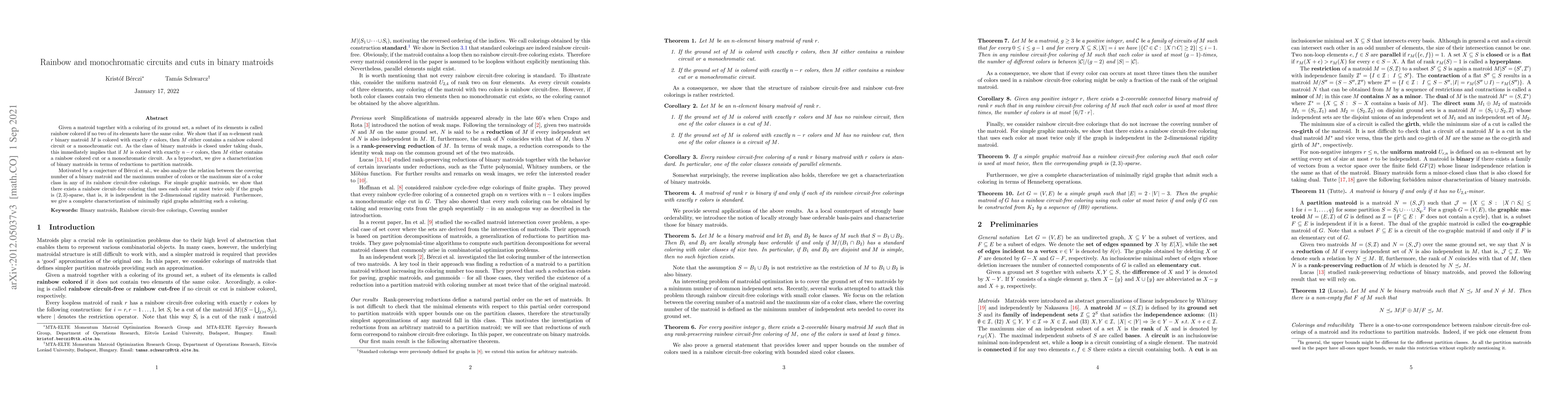 A study on binary matroids shows that with a specific coloring, either a rainbow circuit or a monochromatic cut must exist, providing insight into the structure of these mathematical objects.