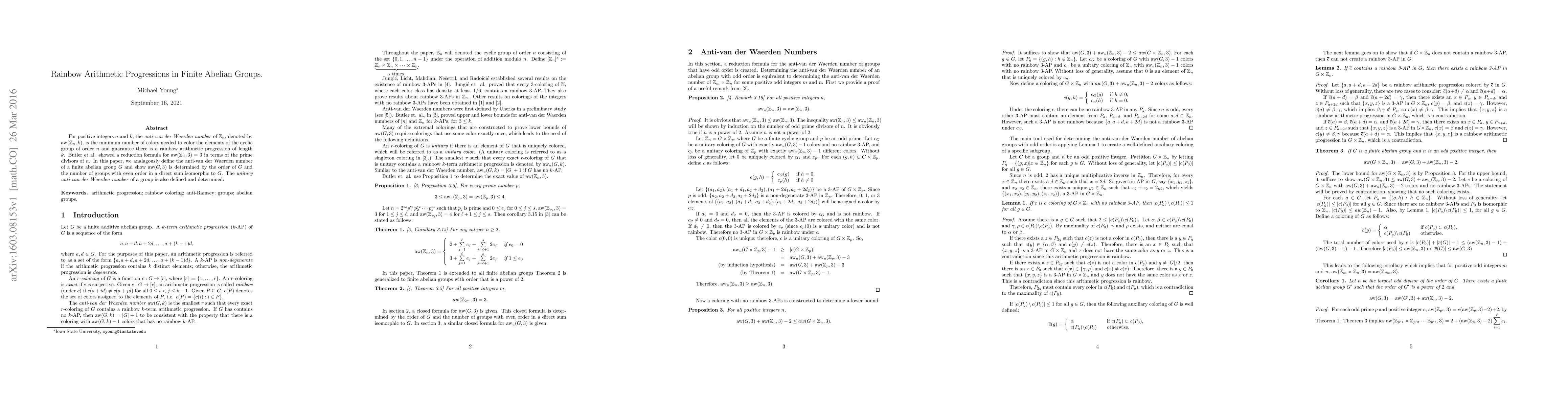 For positive integers $n$ and $k$, the \emph{anti-van der Waerden number} of $\mathbb{Z}_n$, denoted by $aw(\mathbb{Z}_n,k)$, is the minimum number of colors needed to color the elements of the cyclic group of order $n$ and guarantee there is a rainbow arithmetic progression of length $k$. Butler et al. showed a reduction formula for $aw(\mathbb{Z}_{n},3) = 3$ in terms of the prime divisors of $n$. In this paper, we analagously define the anti-van der Waerden number of a finite abelian group $G$ and show $aw(G,3)$ is determined by the order of $G$ and the number of groups with even order in a direct sum isomorphic to $G$. The \emph{unitary anti-van der Waerden number} of a group is also defined and determined.