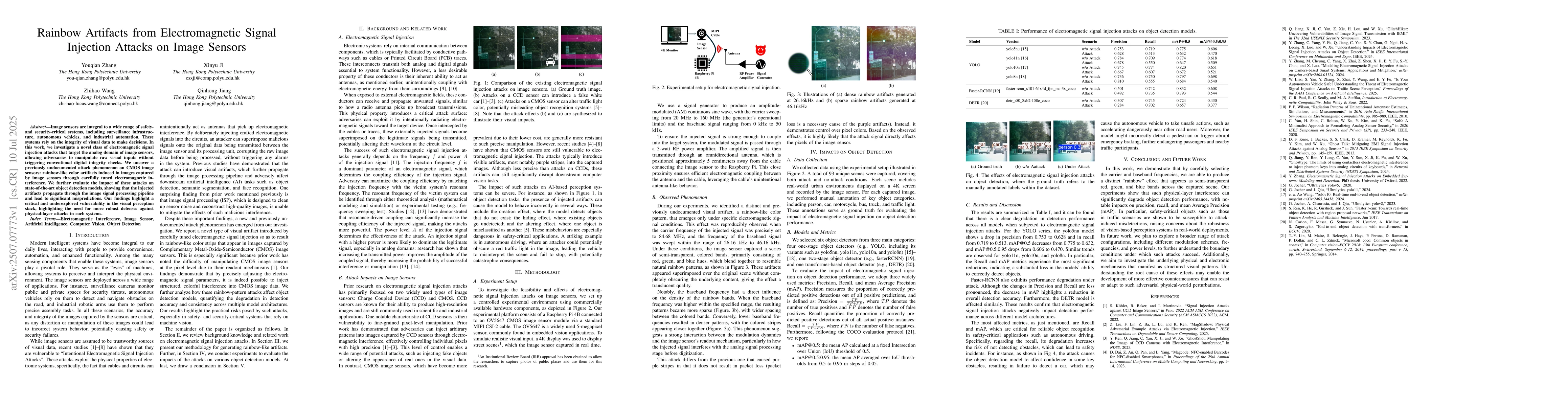 Image sensors are integral to a wide range of safety- and security-critical systems, including surveillance infrastructure, autonomous vehicles, and industrial automation. These systems rely on the integrity of visual data to make decisions. In this work, we investigate a novel class of electromagnetic signal injection attacks that target the analog domain of image sensors, allowing adversaries to manipulate raw visual inputs without triggering conventional digital integrity checks. We uncover a previously undocumented attack phenomenon on CMOS image sensors: rainbow-like color artifacts induced in images captured by image sensors through carefully tuned electromagnetic interference. We further evaluate the impact of these attacks on state-of-the-art object detection models, showing that the injected artifacts propagate through the image signal processing pipeline and lead to significant mispredictions. Our findings highlight a critical and underexplored vulnerability in the visual perception stack, highlighting the need for more robust defenses against physical-layer attacks in such systems.