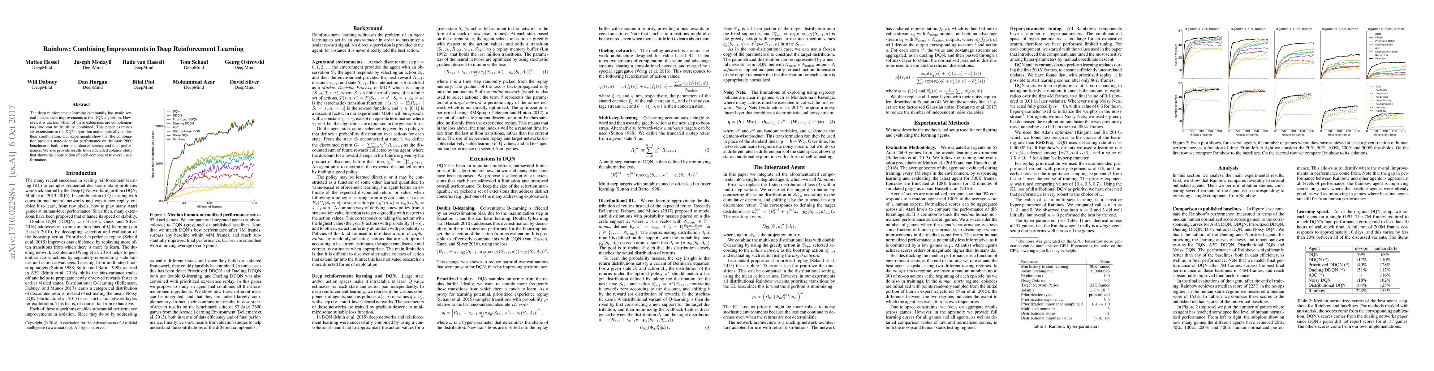 The deep reinforcement learning community has made several independent improvements to the DQN algorithm. However, it is unclear which of these extensions are complementary and can be fruitfully combined. This paper examines six extensions to the DQN algorithm and empirically studies their combination. Our experiments show that the combination provides state-of-the-art performance on the Atari 2600 benchmark, both in terms of data efficiency and final performance. We also provide results from a detailed ablation study that shows the contribution of each component to overall performance.