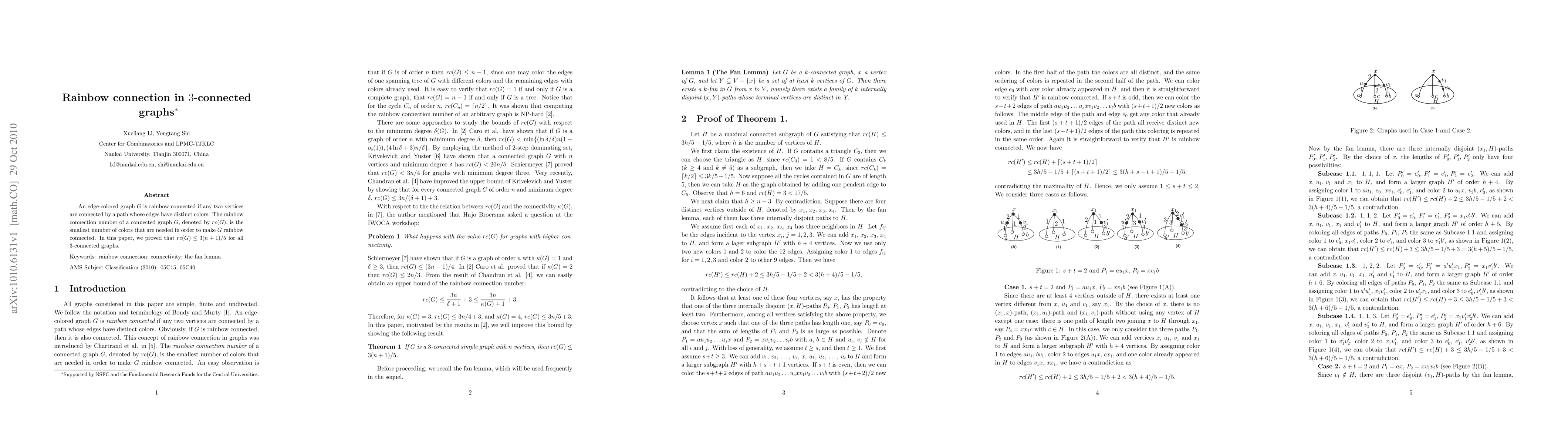 The paper presents a novel approach to bounding the rainbow connection number for 3-connected graphs, utilizing a maximal subgraph H and the fan lemma to establish the upper limit rc(G) ≤ 3(n+1)/5.