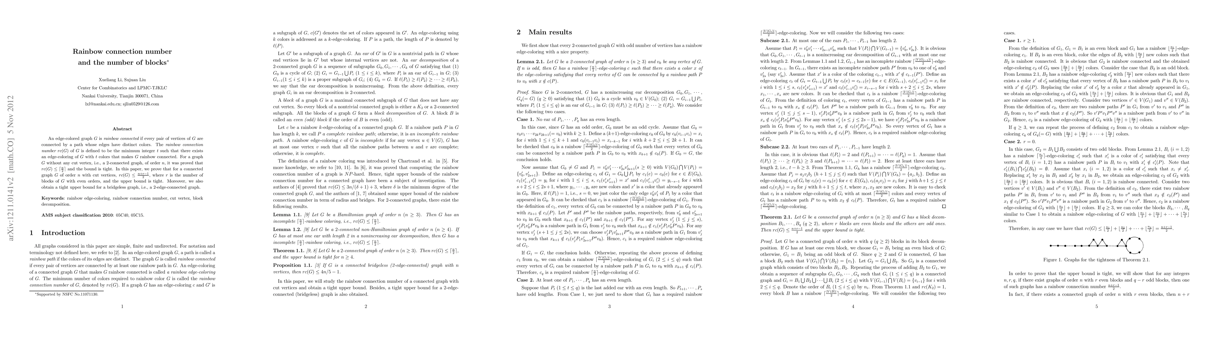 An edge-colored graph $G$ is rainbow connected if every pair of vertices of $G$ are connected by a path whose edges have distinct colors. The rainbow connection number $rc(G)$ of $G$ is defined to be the minimum integer $t$ such that there exists an edge-coloring of $G$ with $t$ colors that makes $G$ rainbow connected. For a graph $G$ without any cut vertex, i.e., a 2-connected graph, of order $n$, it was proved that $rc(G)\leq \lceil\frac n 2 \rceil$ and the bound is tight. In this paper, we prove that for a connected graph $G$ of order $n$ with cut vertices, $rc(G) \leq\frac{n+r-1} 2$, where $r$ is the number of blocks of $G$ with even orders, and the upper bound is tight. Moreover, we also obtain a tight upper bound for a bridgeless graph, i.e., a 2-edge-connected graph.