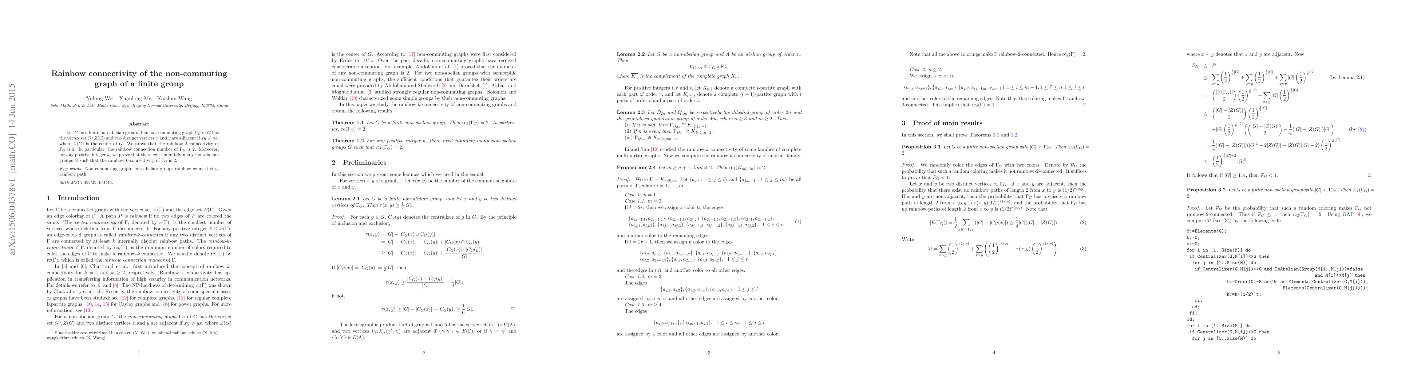 This paper investigates the non-commuting graph $\Gamma_G$ of a finite non-abelian group $G$, showing that its rainbow $2$-connectivity is $2$. It also proves that for any positive integer $k$, there exist infinitely many such groups $G$ where the rainbow $k$-connectivity of $\Gamma_G$ remains $2$.