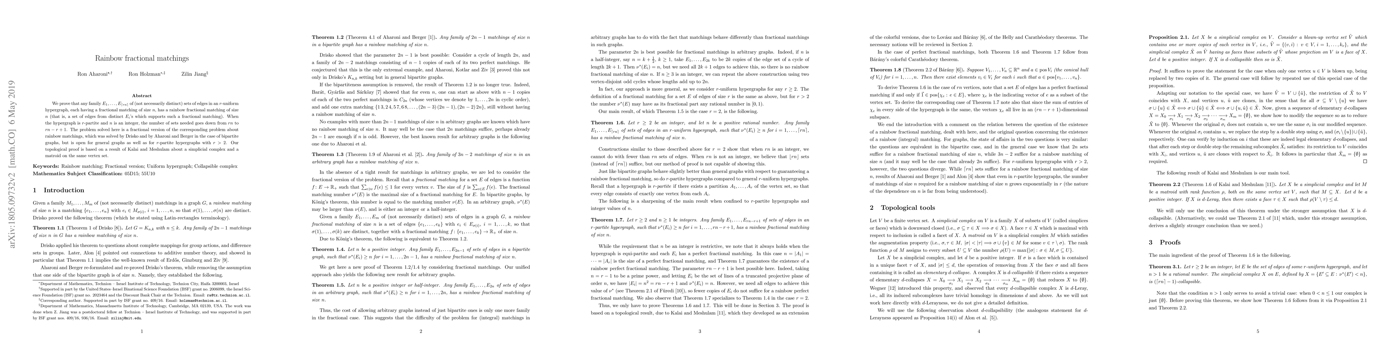 We prove that any family $E_1, \ldots , E_{\lceil rn \rceil}$ of (not necessarily distinct) sets of edges in an $r$-uniform hypergraph, each having a fractional matching of size $n$, has a rainbow fractional matching of size $n$ (that is, a set of edges from distinct $E_i$'s which supports such a fractional matching). When the hypergraph is $r$-partite and $n$ is an integer, the number of sets needed goes down from $rn$ to $rn-r+1$. The problem solved here is a fractional version of the corresponding problem about rainbow matchings, which was solved by Drisko and by Aharoni and Berger in the case of bipartite graphs, but is open for general graphs as well as for $r$-partite hypergraphs with $r>2$. Our topological proof is based on a result of Kalai and Meshulam about a simplicial complex and a matroid on the same vertex set.