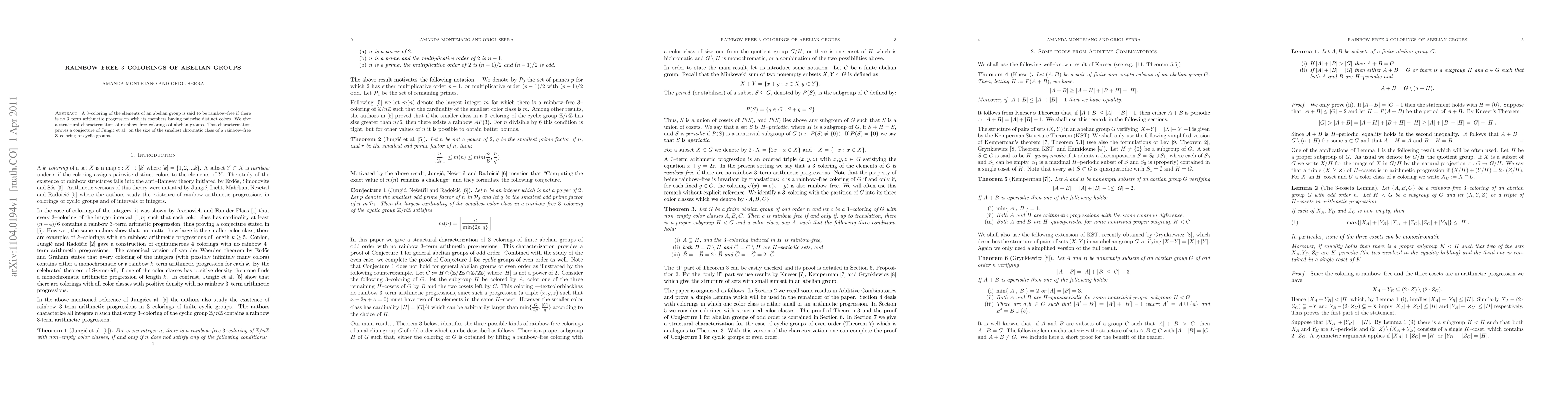 A 3-coloring of the elements of an abelian group is said to be rainbow--free if there is no 3-term arithmetic progression with its members having pairwise distinct colors. We give a structural characterization of rainbow--free colorings of abelian groups. This characterization proves a conjecture of Jungi\'c et al. on the size of the smallest chromatic class of a rainbow-free 3-coloring of cyclic groups.