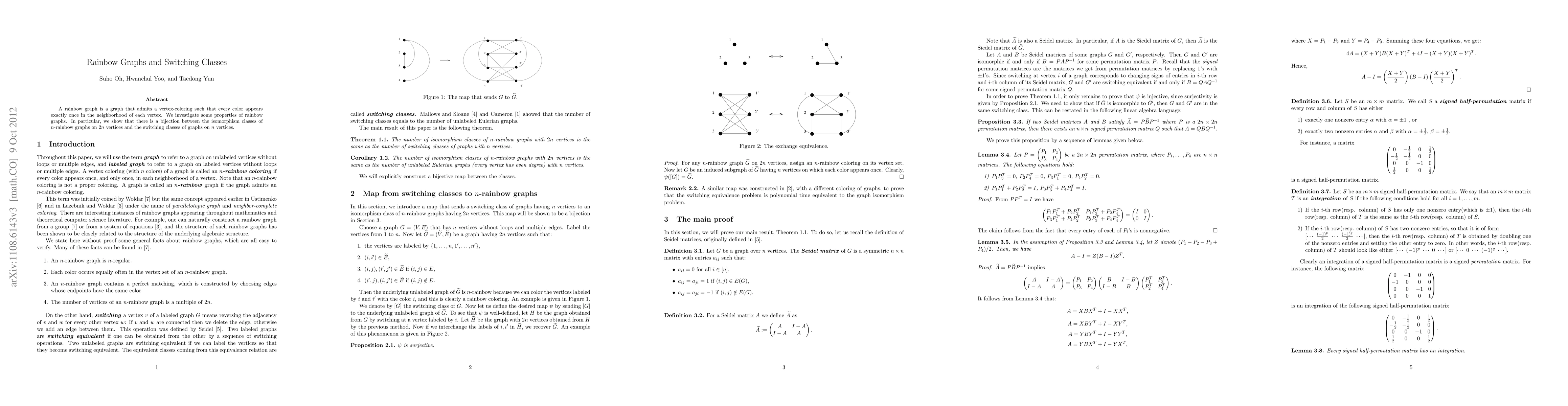 This paper explores the properties of rainbow graphs, which are vertex-colored graphs where each color appears exactly once in each vertex's neighborhood. It establishes a bijection between the isomorphism classes of n-rainbow graphs on 2n vertices and the switching classes of graphs on n vertices.