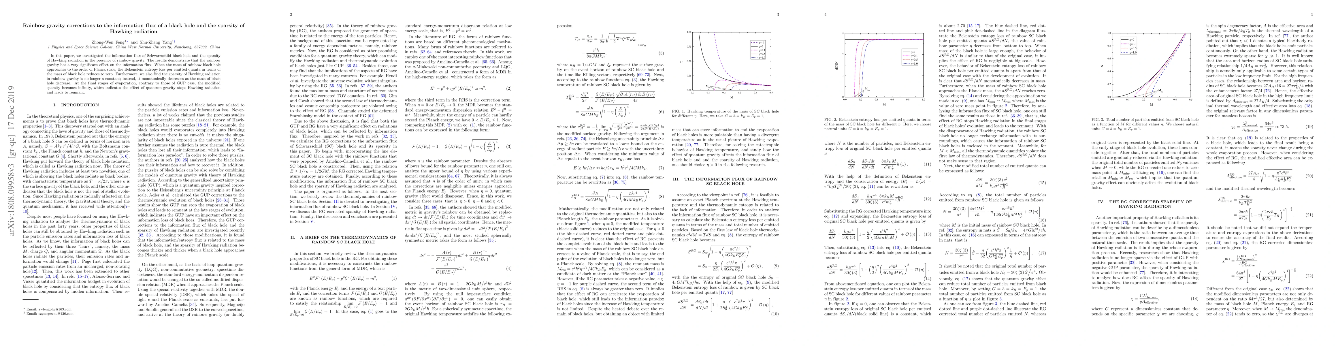 This paper examines the impact of rainbow gravity on the information flux and sparsity of Hawking radiation for a Schwarzschild black hole. It finds that rainbow gravity significantly alters the information flux, reducing the Bekenstein entropy loss to zero at the Planck scale, and causes the sparsity of Hawking radiation to decrease and eventually become infinite, suggesting a quantum gravity-induced remnant at the black hole's final stages of evaporation.