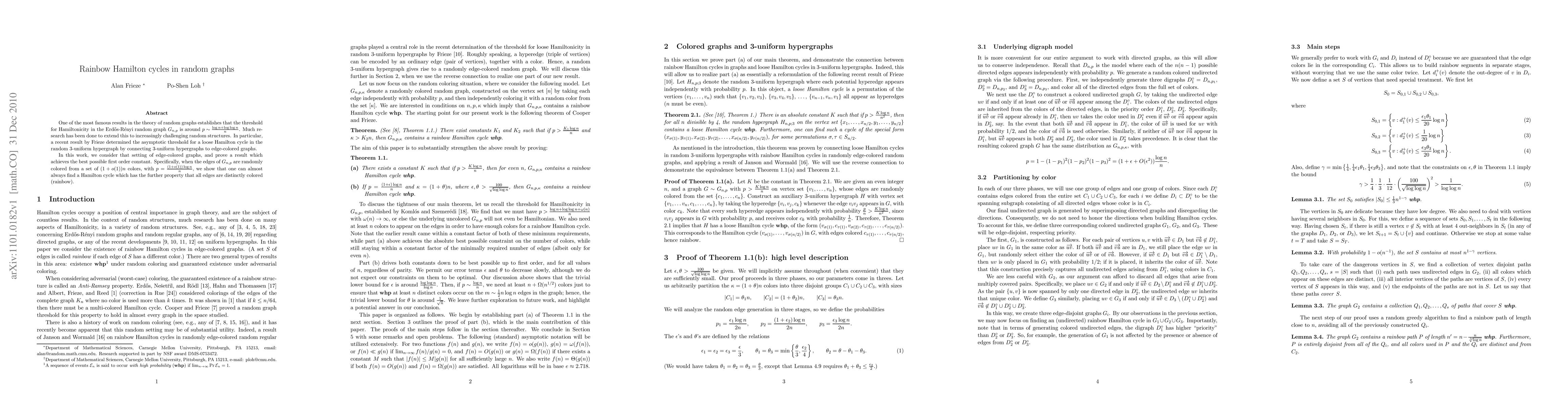 This paper explores the threshold for Hamiltonicity in edge-colored random graphs, proving that a rainbow Hamilton cycle can almost always be found when edges of G_{n,p} are colored with (1 + o(1)) n colors and p = (1 + o(1)) (log n) / n, achieving the best first-order constant.