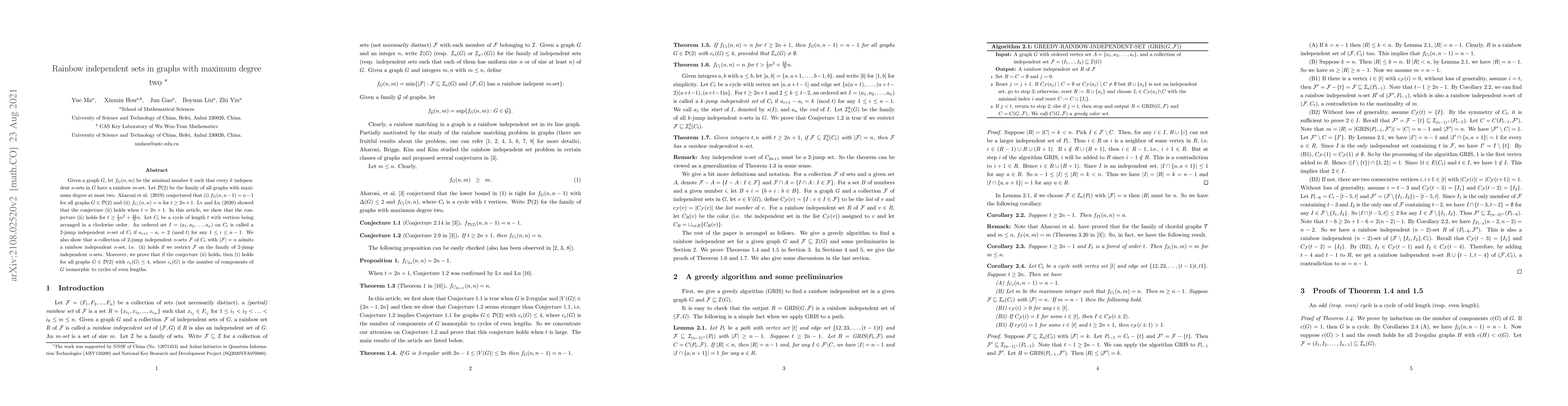 Given a graph $G$, let $f_{G}(n,m)$ be the minimal number $k$ such that every $k$ independent $n$-sets in $G$ have a rainbow $m$-set. Let $\mathcal{D}(2)$ be the family of all graphs with maximum degree at most two. Aharoni et al. (2019) conjectured that (i) $f_G(n,n-1)=n-1$ for all graphs $G\in\mathcal{D}(2)$ and (ii) $f_{C_t}(n,n)=n$ for $t\ge 2n+1$. Lv and Lu (2020) showed that the conjecture (ii) holds when $t=2n+1$. In this article, we show that the conjecture (ii) holds for $t\ge\frac{1}{3}n^2+\frac{44}{9}n$. Let $C_t$ be a cycle of length $t$ with vertices being arranged in a clockwise order. An ordered set $I=(a_1,a_2,\ldots,a_n)$ on $C_t$ is called a $2$-jump independent $n$-set of $C_t$ if $a_{i+1}-a_i=2\pmod{t}$ for any $1\le i\le n-1$. We also show that a collection of 2-jump independent $n$-sets $\mathcal{F}$ of $C_t$ with $|\mathcal{F}|=n$ admits a rainbow independent $n$-set, i.e. (ii) holds if we restrict $\mathcal{F}$ on the family of 2-jump independent $n$-sets. Moreover, we prove that if the conjecture (ii) holds, then (i) holds for all graphs $G\in\mathcal{D}(2)$ with $c_e(G)\le 4$, where $c_e(G)$ is the number of components of $G$ isomorphic to cycles of even lengths.
