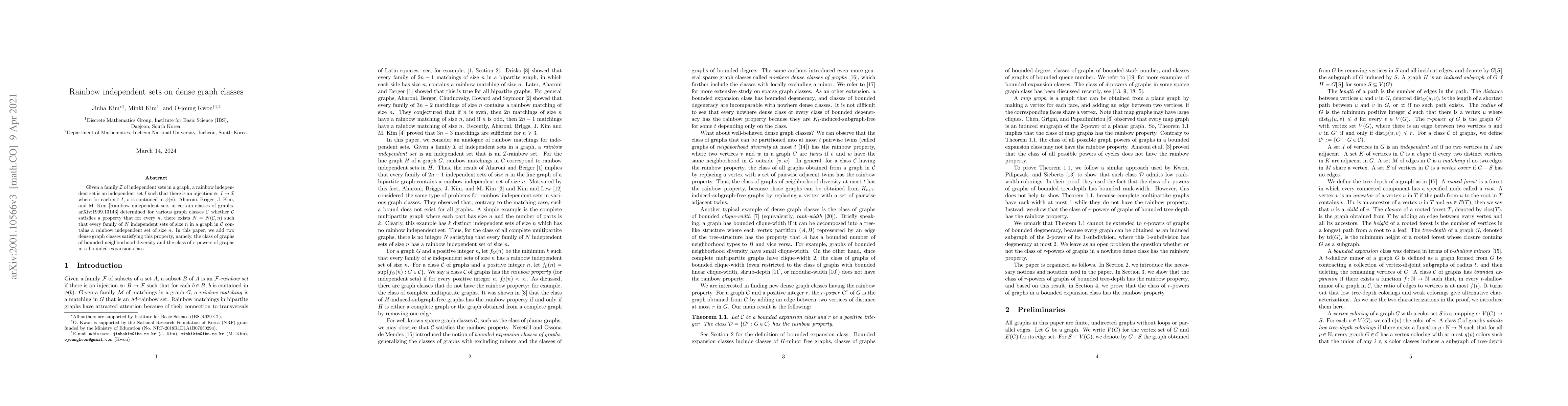 This paper investigates rainbow independent sets in two dense graph classes: graphs with bounded neighborhood diversity and $r$-powers of graphs in a bounded expansion class. It confirms that these classes satisfy a property where every sufficiently large family of independent sets contains a rainbow independent set.