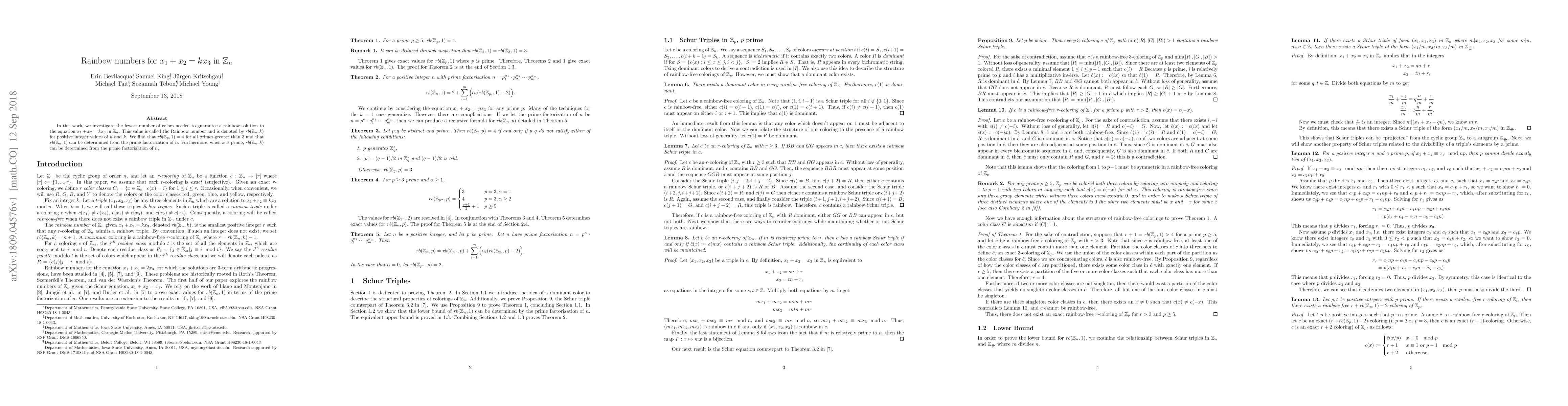 In this work, we investigate the fewest number of colors needed to guarantee a rainbow solution to the equation $x_1 + x_2 = k x_3$ in $\mathbb{Z}_n$. This value is called the Rainbow number and is denoted by $rb(\mathbb{Z}_n, k)$ for positive integer values of $n$ and $k$. We find that $rb(\mathbb{Z}_p, 1) = 4$ for all primes greater than $3$ and that $rb(\mathbb{Z}_n, 1)$ can be deterimined from the prime factorization of $n$. Furthermore, when $k$ is prime, $rb(\mathbb{Z}_n, k)$ can be determined from the prime factorization of $n$.