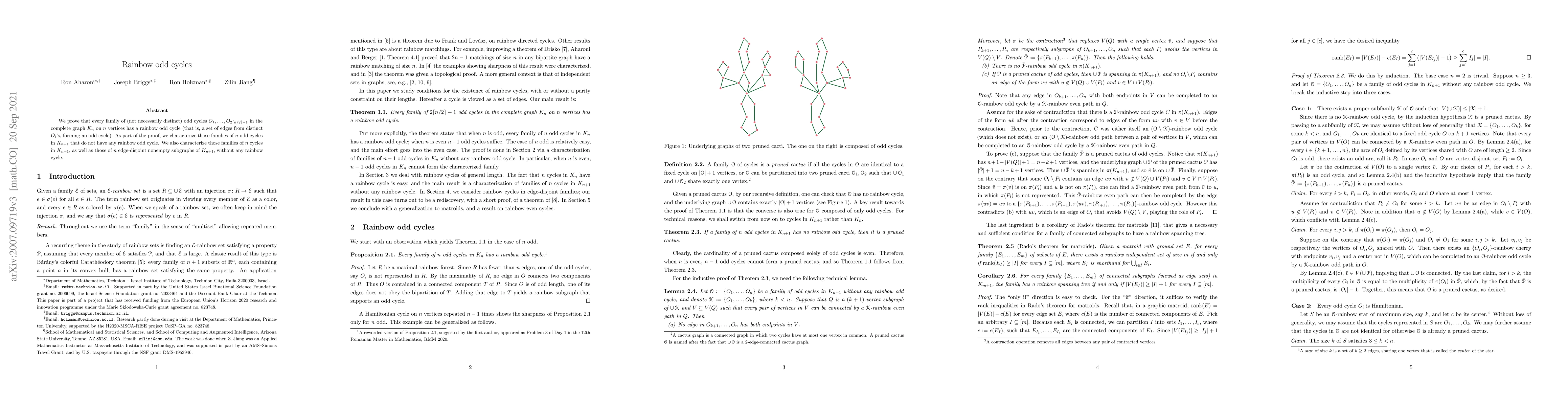 The paper proves the existence of a rainbow odd cycle in any family of $2\lceil n/2 \rceil-1$ odd cycles in $K_n$ and characterizes families of odd cycles in $K_{n+1}$ lacking such a cycle. Additionally, it identifies families of cycles and edge-disjoint subgraphs in $K_{n+1}$ that contain no rainbow cycle.