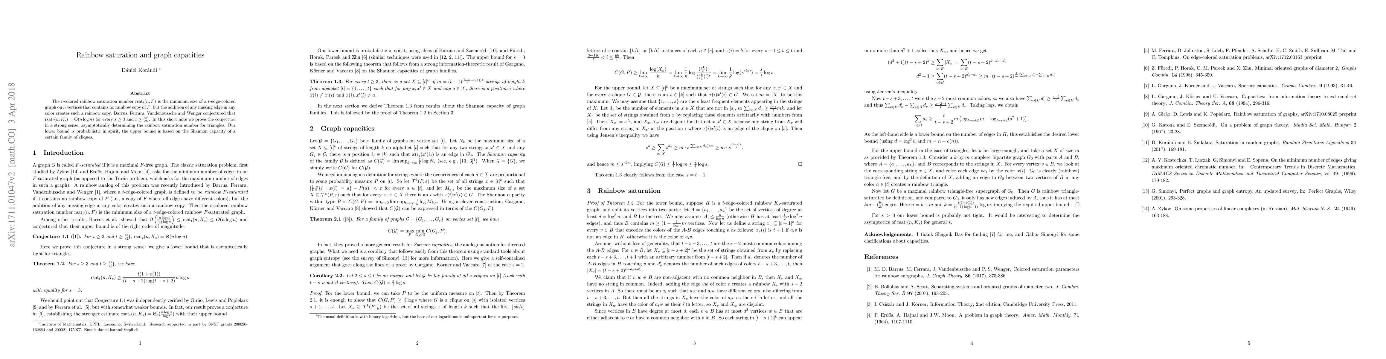 The paper proves a conjecture on the rainbow saturation number for triangles, showing that it is asymptotically equal to $n heta(n)$ where $ heta$ is the Shannon capacity of a certain family of cliques.