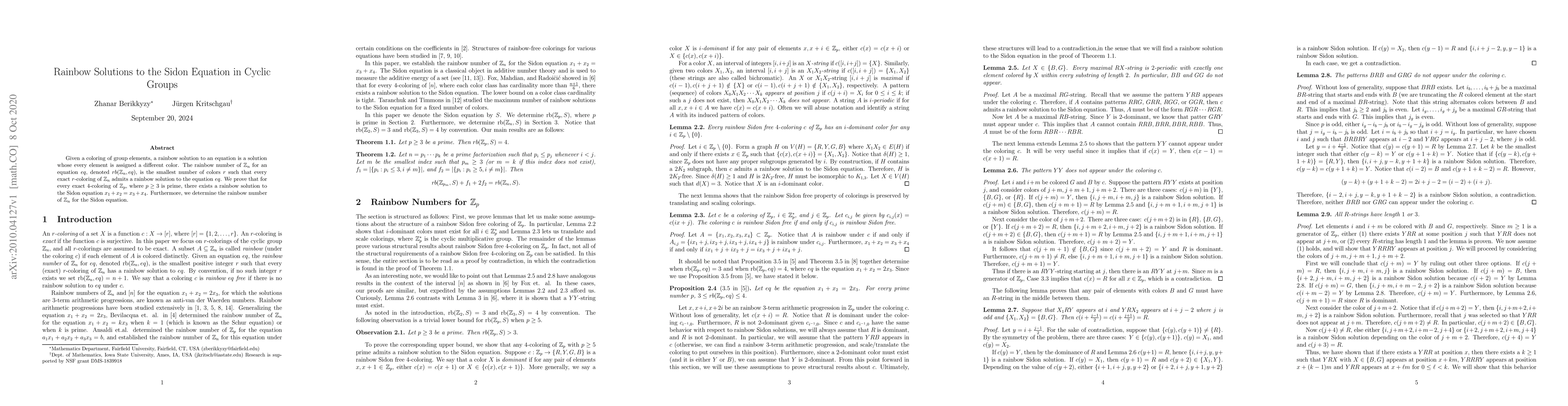 Given a coloring of group elements, a rainbow solution to an equation is a solution whose every element is assigned a different color. The rainbow number of $\mathbb{Z}_n$ for an equation $eq$, denoted $rb(\mathbb{Z}_n,eq)$, is the smallest number of colors $r$ such that every exact $r$-coloring of $\mathbb{Z}_n$ admits a rainbow solution to the equation $eq$. We prove that for every exact $4$-coloring of $\mathbb{Z}_p$, where $p\geq 3$ is prime, there exists a rainbow solution to the Sidon equation $x_1+x_2=x_3+x_4$. Furthermore, we determine the rainbow number of $\mathbb{Z}_n$ for the Sidon equation.
