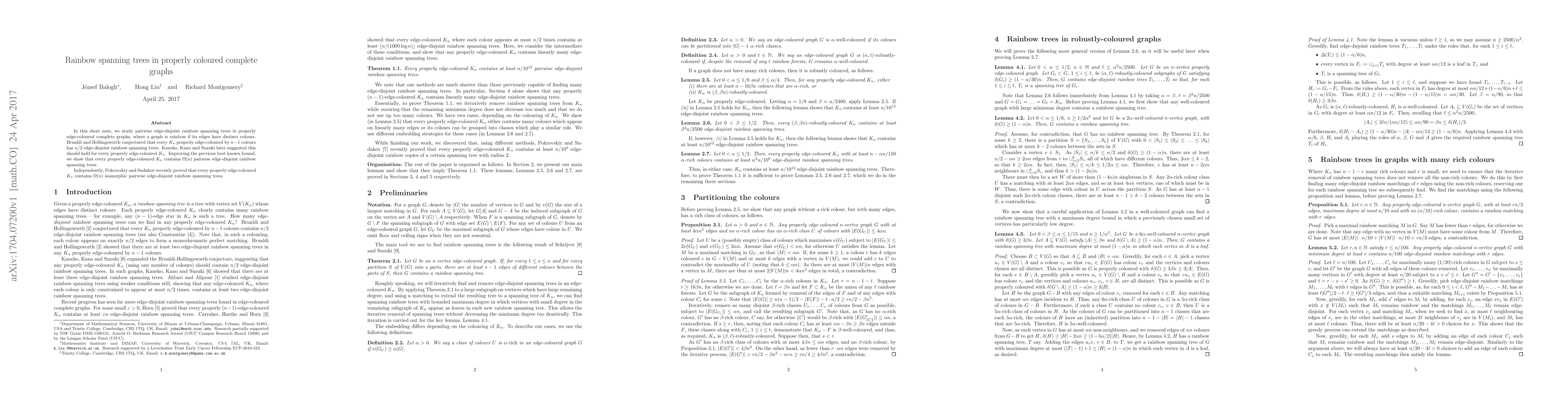 This research investigates rainbow spanning trees in properly edge-coloured complete graphs, proving that every such graph contains $\Omega(n)$ pairwise edge-disjoint rainbow spanning trees, improving on earlier bounds. Independently, Pokrovskiy and Sudakov also demonstrated a similar result for isomorphic rainbow spanning trees.