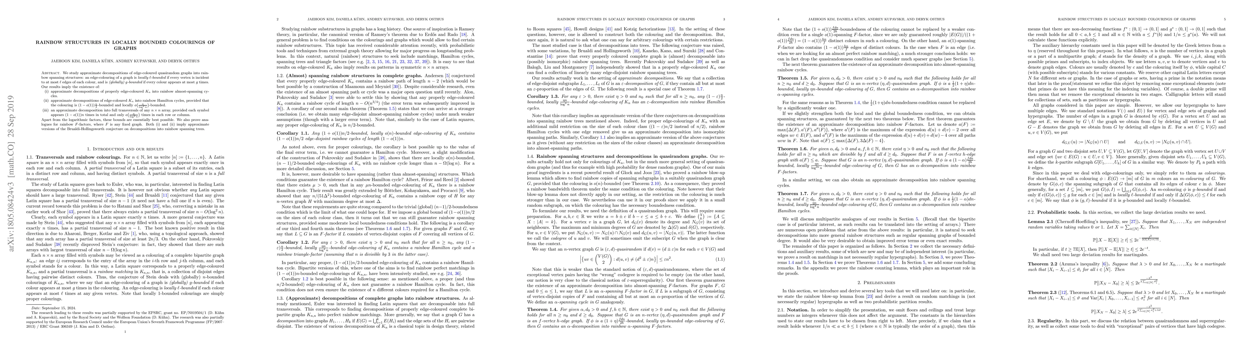 We prove several results on approximate decompositions of edge-coloured quasirandom graphs into rainbow spanning structures. More precisely, we say that an edge-colouring of a graph is locally $\ell$-bounded if no vertex is incident to more than $\ell$ edges of any given colour, and that it is (globally) $g$-bounded if no colour appears more than $g$ times in the colouring. Note that every proper colouring of an $n$-vertex graph is locally $1$-bounded, and (globally) $n/2$-bounded. Our results imply the following: (i) The existence of approximate decompositions of edge-coloured $K_n$ into rainbow almost-spanning cycles, provided that the colouring is $\frac{n}{2}$-bounded and locally $o(n)$-bounded. (ii) The existence of approximate decompositions of edge-coloured $K_n$ into rainbow Hamilton cycles, provided that the colouring is $(1-o(1))\frac n2$-bounded and locally $o\big(\frac{n}{\log^4 n}\big)$-bounded. (iii) A bipartite version of our results implies that every $n\times n$ array, where each symbol appears $(1-o(1))n$ times in total and appears only $o\big(\frac{n}{\log^2 n}\big)$ times in each row or column, has an approximate decomposition into full transversals. We also prove analogues of (i) and (ii) for $F$-factors, where $F$ is any fixed graph. Apart from the logarithmic factor in (ii), all these bounds are essentially best possible. (i) can be viewed as a generalization of a recent result of Alon, Pokrovskiy and Sudakov, who showed the existence of an almost spanning cycle in a properly coloured complete graph. Both (i) and (ii) imply approximate versions of a conjecture of Brualdi and Hollingsworth, stating that every properly edge-coloured complete graph can be decomposed into rainbow spanning trees.