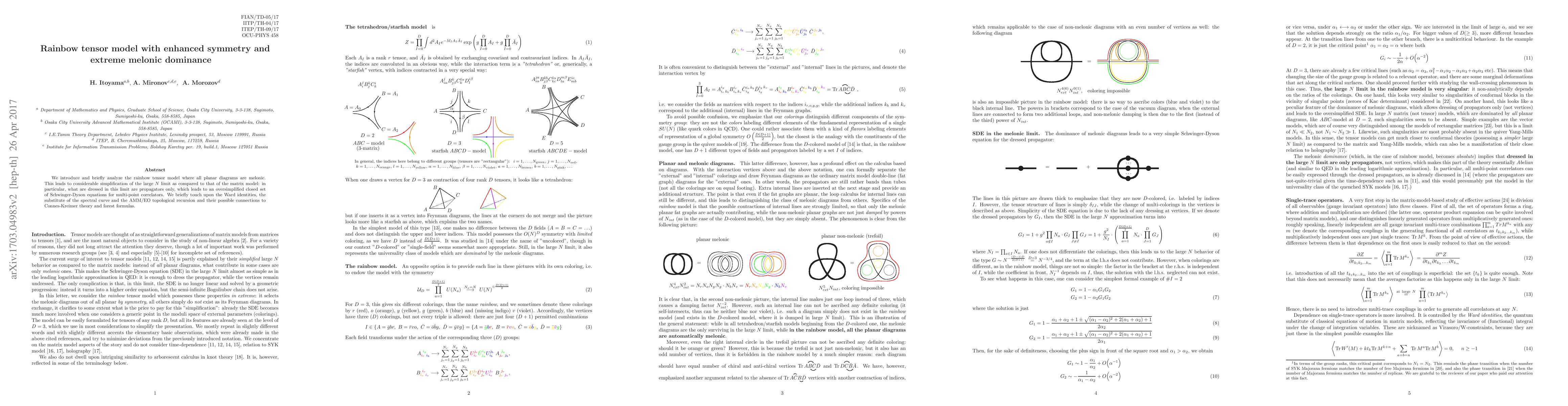 This paper introduces a simplified rainbow tensor model with melonic dominance, significantly easing the large N limit analysis by focusing on propagators. It briefly explores connections to Ward identities, spectral curves, and topological recursion, hinting at links to Connes-Kreimer theory and forest formulas.