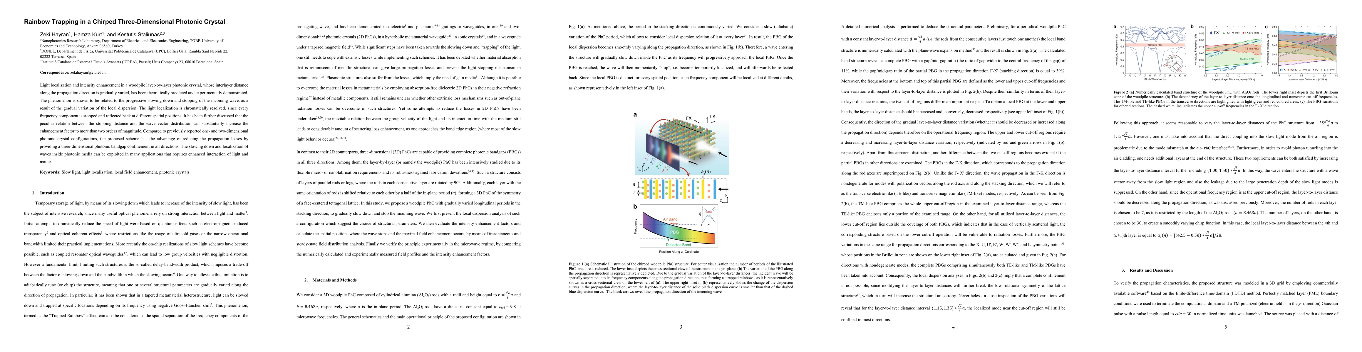 Light localization and intensity enhancement in a woodpile layer-by-layer photonic crystal, whose interlayer distance along the propagation direction is gradually varied, has been theoretically predicted and experimentally demonstrated. The phenomenon is shown to be related to the progressive slowing down and stopping of the incoming wave, as a result of the gradual variation of the local dispersion. The light localization is chromatically resolved, since every frequency component is stopped and reflected back at different spatial positions. It has been further discussed that the peculiar relation between the stopping distance and the wave vector distribution can substantially increase the enhancement factor to more than two orders of magnitude. Compared to previously reported one- and two-dimensional photonic crystal configurations, the proposed scheme has the advantage of reducing the propagation losses by providing a three-dimensional photonic bandgap confinement in all directions. The slowing down and localization of waves inside photonic media can be exploited in many applications that requires enhanced interaction of light and matter.
