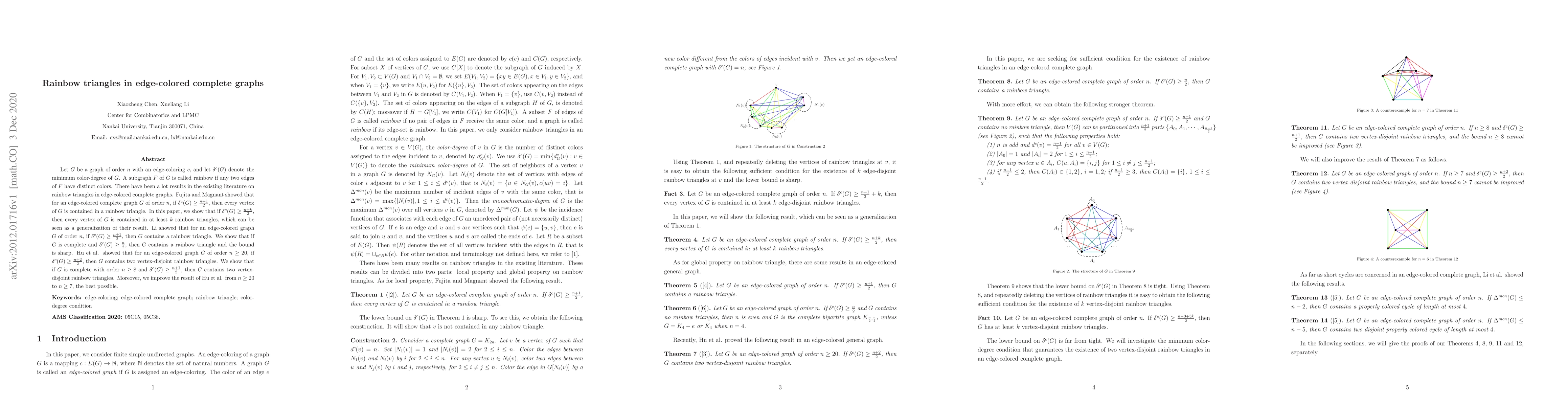 The paper investigates the existence of rainbow triangles in edge-colored complete graphs, generalizing previous results and providing new bounds for the minimum color-degree condition.