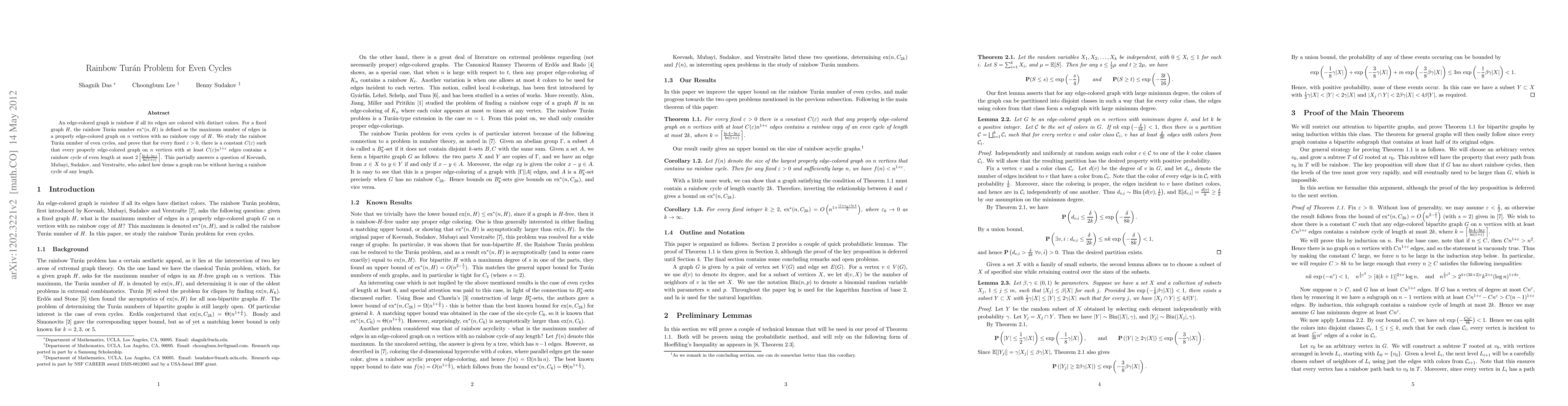 This paper studies the rainbow Tur\'an number for even cycles in edge-colored graphs, proving that any graph with sufficient edges (at least $C(\varepsilon) n^{1 + \varepsilon}$) contains a rainbow cycle of even length up to a specific bound, thereby addressing a question on the density of such graphs without rainbow cycles.