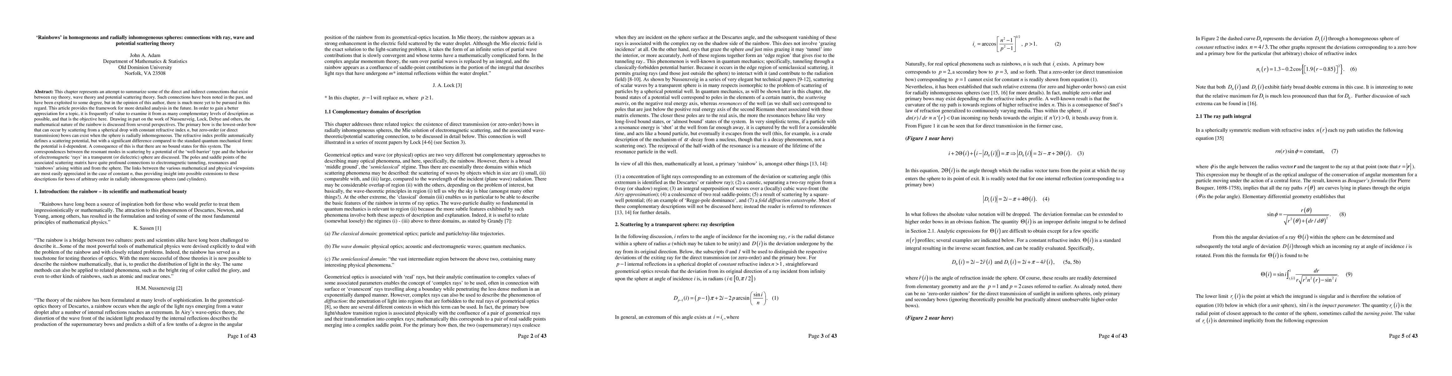 This chapter represents an attempt to summarize some of the direct and indirect connections that exist between ray theory, wave theory and potential scattering theory. Such connections have been noted in the past, and have been exploited to some degree, but in the opinion of this author, there is much more yet to be pursued in this regard. This article provides the framework for more detailed analysis in the future. In order to gain a better appreciation for a topic, it is frequently of value to examine it from as many complementary levels of description as possible, and that is the objective here. Drawing in part on the work of Nussenzveig, Lock, Debye and others, the mathematical nature of the rainbow is discussed from several perspectives. The primary bow is the lowest-order bow that can occur by scattering from a spherical drop with constant refractive index n, but zero-order (or direct transmission) bows can exist when the sphere is radially inhomogeneous. The refractive index profile automatically defines a scattering potential, but with a significant difference compared to the standard quantum mechanical form: the potential is k-dependent. A consequence of this is that there are no bound states for this system. The correspondences between the resonant modes in scattering by a potential of the well-barrier type and the behavior of electromagnetic rays in a transparent (or dielectric) sphere are discussed. The poles and saddle points of the associated scattering matrix have quite profound connections to electromagnetic tunneling, resonances and bows arising within and from the sphere. The links between the various mathematical and physical viewpoints are most easily appreciated in the case of constant n, thus providing insight into possible extensions to these descriptions for bows of arbitrary order in radially inhomogeneous spheres (and cylinders).