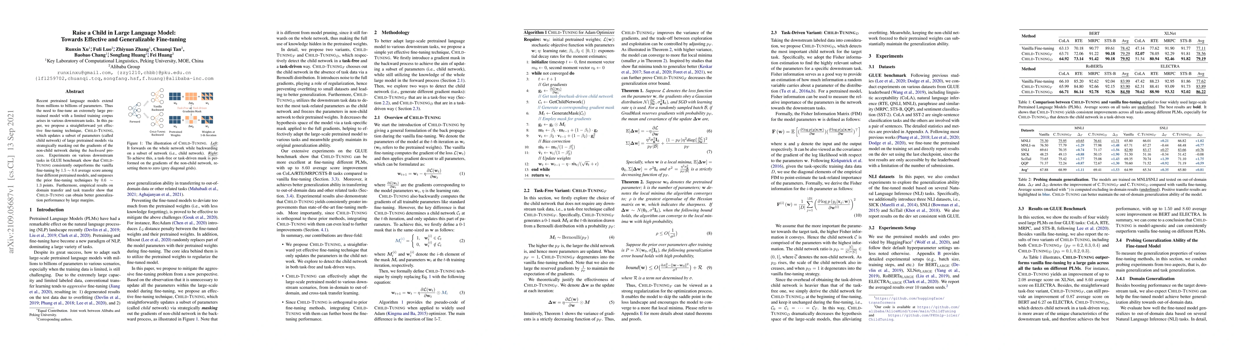 This paper introduces Child-Tuning, a fine-tuning technique that updates a subset of parameters in large pretrained language models, outperforming traditional fine-tuning and prior methods on GLUE benchmarks and demonstrating better generalization across tasks.