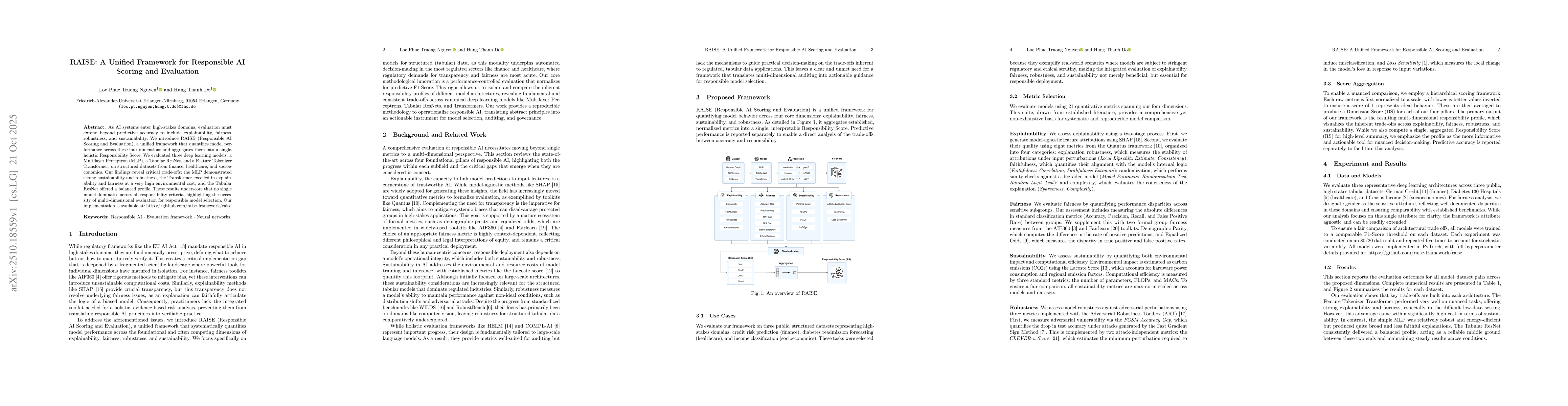 As AI systems enter high-stakes domains, evaluation must extend beyond predictive accuracy to include explainability, fairness, robustness, and sustainability. We introduce RAISE (Responsible AI Scoring and Evaluation), a unified framework that quantifies model performance across these four dimensions and aggregates them into a single, holistic Responsibility Score. We evaluated three deep learning models: a Multilayer Perceptron (MLP), a Tabular ResNet, and a Feature Tokenizer Transformer, on structured datasets from finance, healthcare, and socioeconomics. Our findings reveal critical trade-offs: the MLP demonstrated strong sustainability and robustness, the Transformer excelled in explainability and fairness at a very high environmental cost, and the Tabular ResNet offered a balanced profile. These results underscore that no single model dominates across all responsibility criteria, highlighting the necessity of multi-dimensional evaluation for responsible model selection. Our implementation is available at: https://github.com/raise-framework/raise.