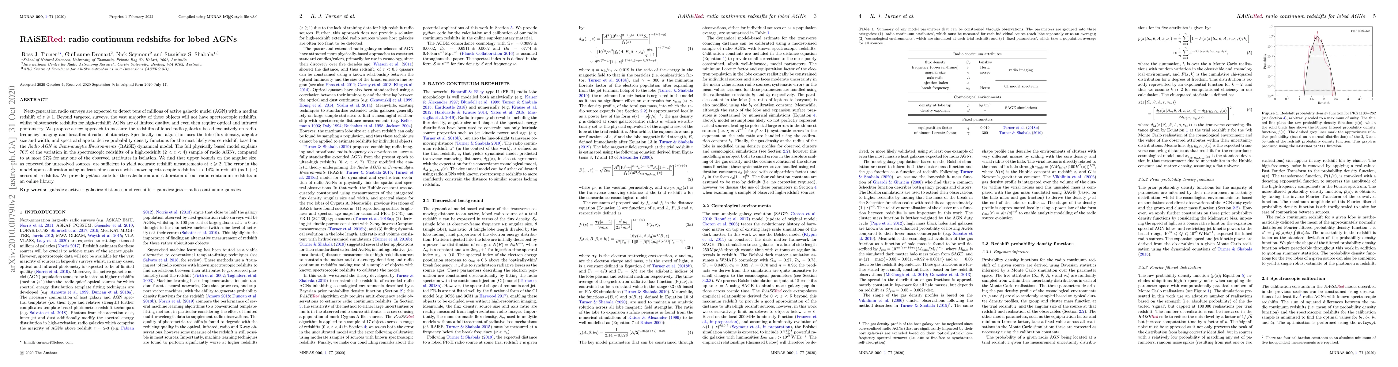 The RAiSERed model uses radio-frequency imaging and photometry of extended radio AGNs to generate redshift probability density functions.