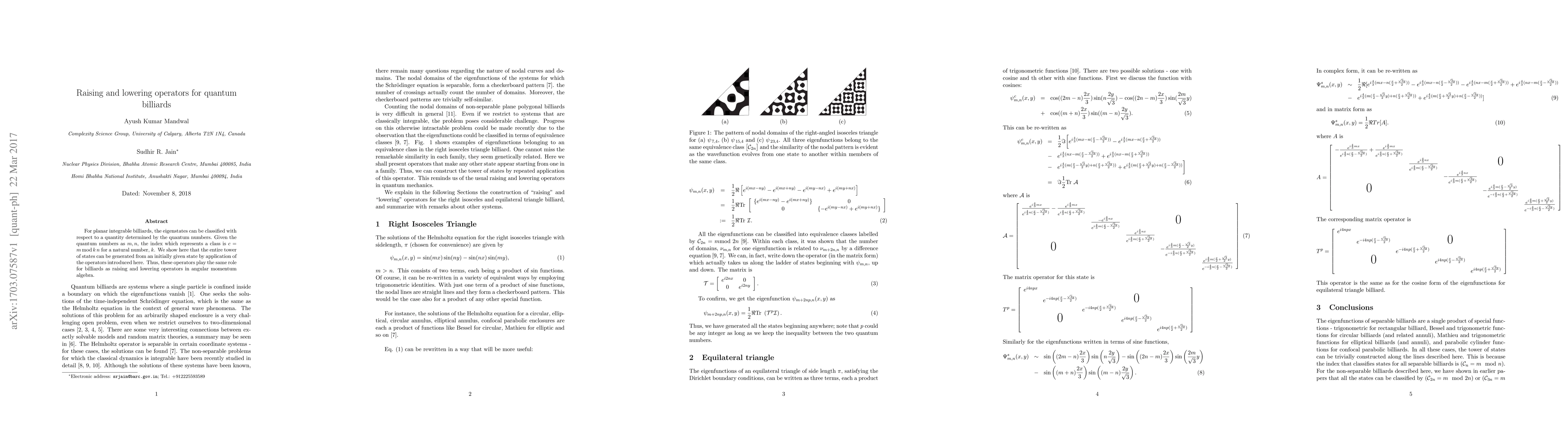 This paper introduces raising and lowering operators for planar integrable billiards, demonstrating how they can generate all eigenstates from a given initial state, analogous to their role in angular momentum algebra. The classification of eigenstates is based on a quantum index determined by quantum numbers $m$ and $n$.