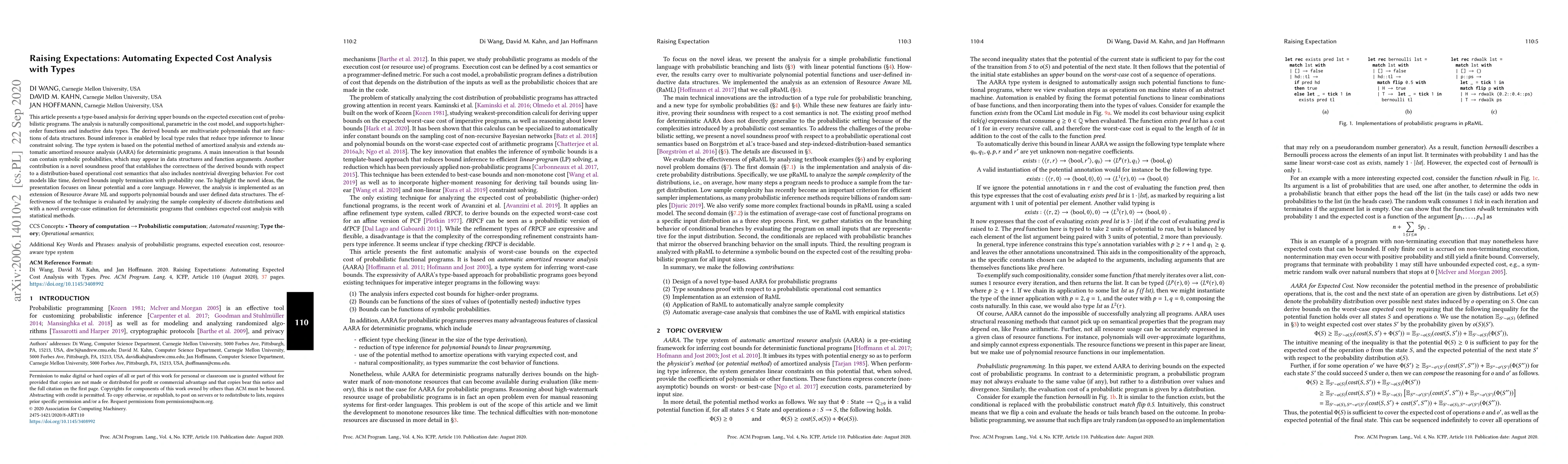 This article presents a type-based analysis for deriving upper bounds on the expected execution cost of probabilistic programs. The analysis is naturally compositional, parametric in the cost model, and supports higher order functions and inductive data types. The derived bounds are multivariate polynomials that are functions of data structures. Bound inference is enabled by local type rules that reduce type inference to linear constraint solving. The type system is based on the potential method of amortized analysis and extends automatic amortized resource analysis (AARA) for deterministic programs. A main innovation is that bounds can contain symbolic probabilities, which may appear in data structures and function arguments. Another contribution is a novel soundness proof that establishes the correctness of the derived bounds with respect to a distribution-based operational cost semantics that also includes nontrivial diverging behavior. For cost models like time, derived bounds imply termination with probability one. To highlight the novel ideas, the presentation focuses on linear potential and a core language. However, the analysis is implemented as an extension of Resource Aware ML and supports polynomial bounds and user defined data structures. The effectiveness of the technique is evaluated by analyzing the sample complexity of discrete distributions and with a novel average-case estimation for deterministic programs that combines expected cost analysis with statistical methods.