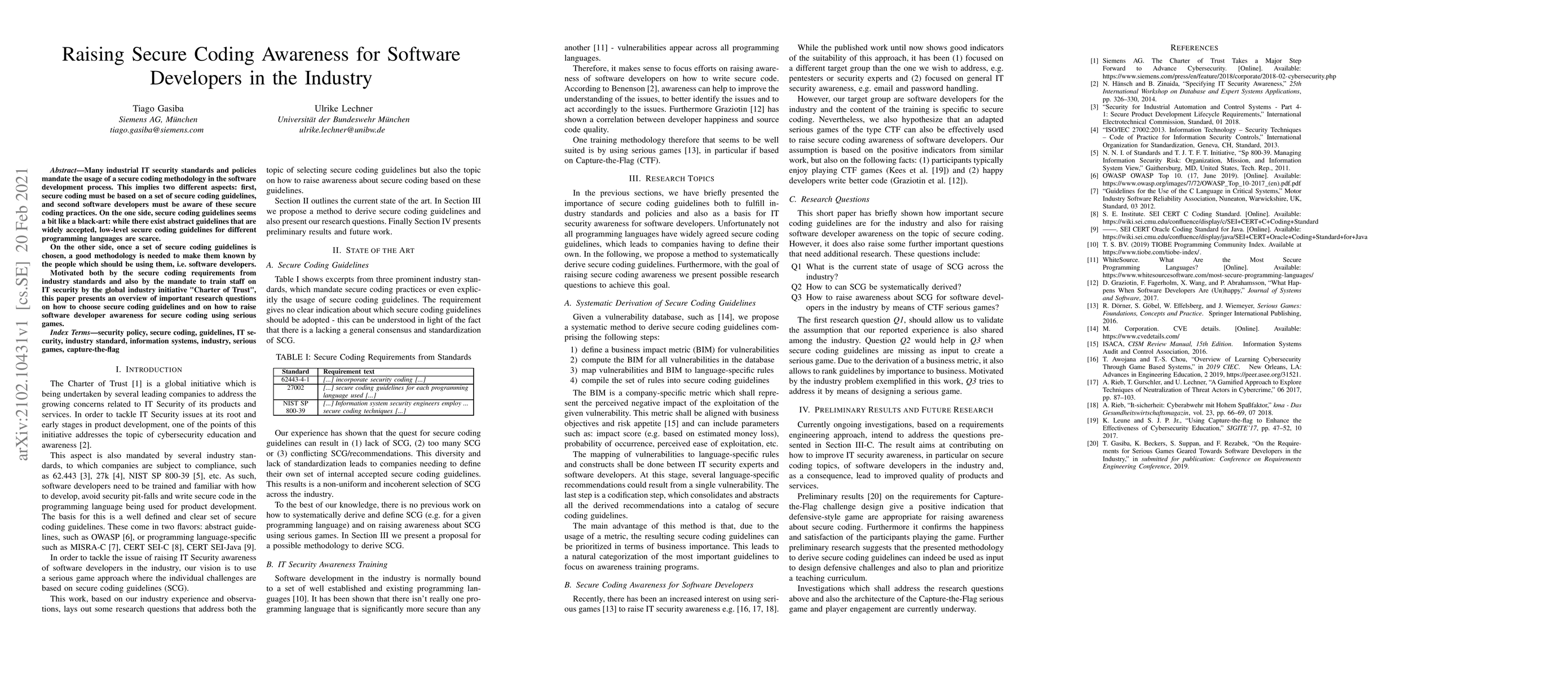 Many industrial IT security standards and policies mandate the usage of a secure coding methodology in the software development process. This implies two different aspects: first, secure coding must be based on a set of secure coding guidelines, and second software developers must be aware of these secure coding practices. On the one side, secure coding guidelines seems a bit like a black-art: while there exist abstract guidelines that are widely accepted, low-level secure coding guidelines for different programming languages are scarce. On the other side, once a set of secure coding guidelines is chosen, a good methodology is needed to make them known by the people which should be using them, i.e. software developers. Motivated both by the secure coding requirements from industry standards and also by the mandate to train staff on IT security by the global industry initiative "Charter of Trust", this paper presents an overview of important research questions on how to choose secure coding guidelines and on how to raise software developer awareness for secure coding using serious games.
