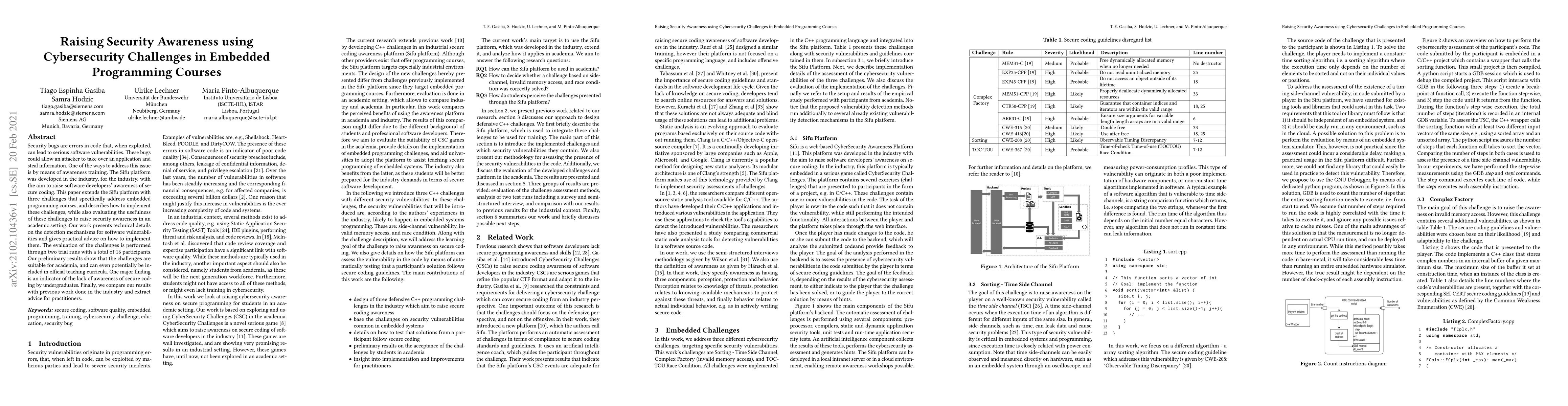 Security bugs are errors in code that, when exploited, can lead to serious software vulnerabilities. These bugs could allow an attacker to take over an application and steal information. One of the ways to address this issue is by means of awareness training. The Sifu platform was developed in the industry, for the industry, with the aim to raise software developers' awareness of secure coding. This paper extends the Sifu platform with three challenges that specifically address embedded programming courses, and describes how to implement these challenges, while also evaluating the usefulness of these challenges to raise security awareness in an academic setting. Our work presents technical details on the detection mechanisms for software vulnerabilities and gives practical advice on how to implement them. The evaluation of the challenges is performed through two trial runs with a total of 16 participants. Our preliminary results show that the challenges are suitable for academia, and can even potentially be included in official teaching curricula. One major finding is an indicator of the lack of awareness of secure coding by undergraduates. Finally, we compare our results with previous work done in the industry and extract advice for practitioners.