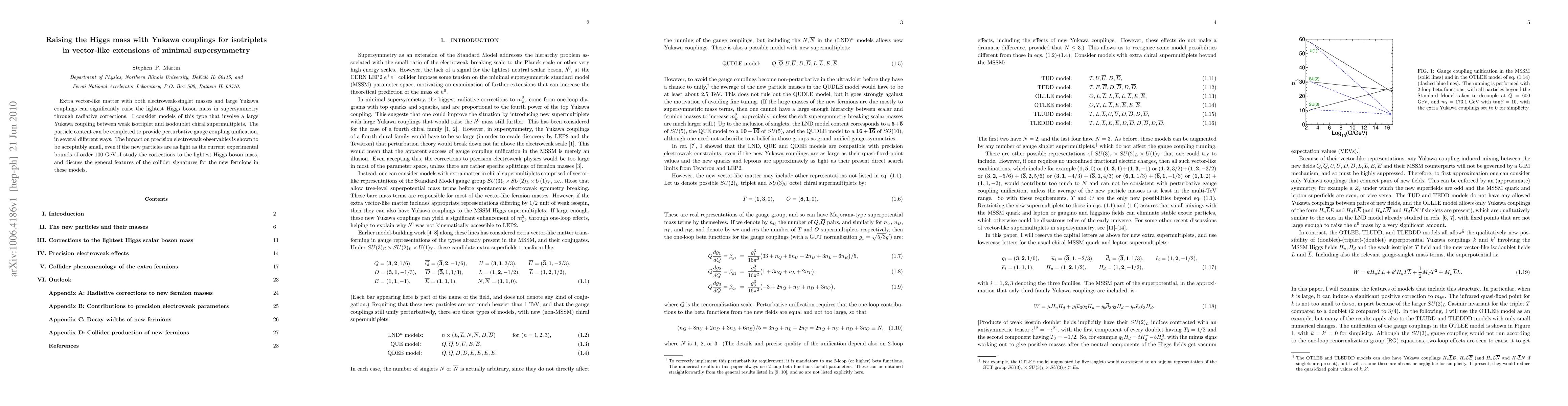 This paper explores supersymmetric models with vector-like extensions that utilize large Yukawa couplings between isotriplet and isodoublet chiral supermultiplets to significantly raise the lightest Higgs boson mass. It demonstrates that these models can achieve perturbative gauge coupling unification while keeping precision electroweak observables within acceptable limits, even if the new particles are as light as 100 GeV.