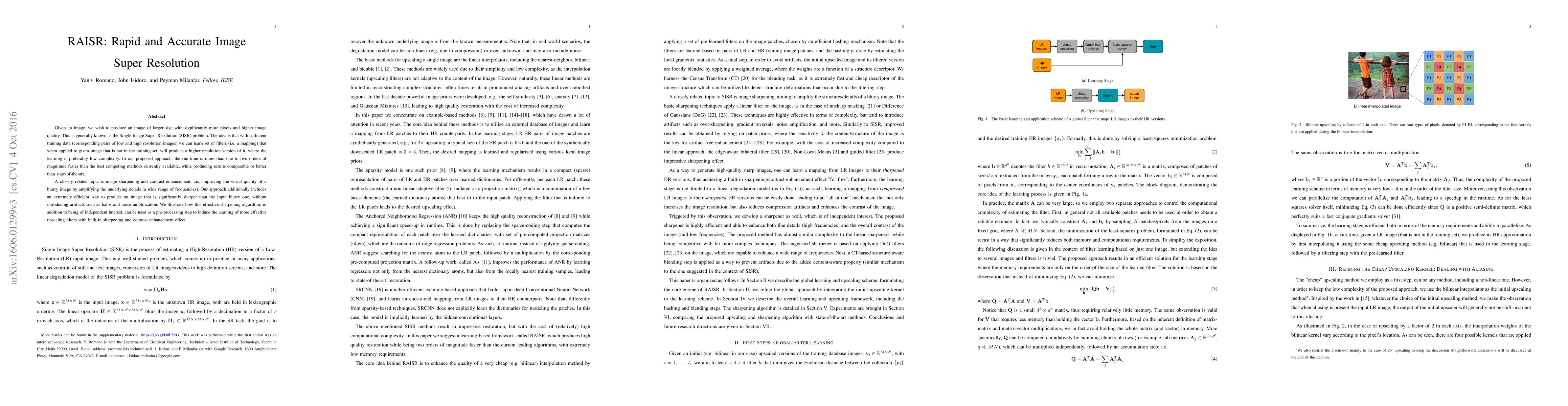 Given an image, we wish to produce an image of larger size with significantly more pixels and higher image quality. This is generally known as the Single Image Super-Resolution (SISR) problem. The idea is that with sufficient training data (corresponding pairs of low and high resolution images) we can learn set of filters (i.e. a mapping) that when applied to given image that is not in the training set, will produce a higher resolution version of it, where the learning is preferably low complexity. In our proposed approach, the run-time is more than one to two orders of magnitude faster than the best competing methods currently available, while producing results comparable or better than state-of-the-art. A closely related topic is image sharpening and contrast enhancement, i.e., improving the visual quality of a blurry image by amplifying the underlying details (a wide range of frequencies). Our approach additionally includes an extremely efficient way to produce an image that is significantly sharper than the input blurry one, without introducing artifacts such as halos and noise amplification. We illustrate how this effective sharpening algorithm, in addition to being of independent interest, can be used as a pre-processing step to induce the learning of more effective upscaling filters with built-in sharpening and contrast enhancement effect.