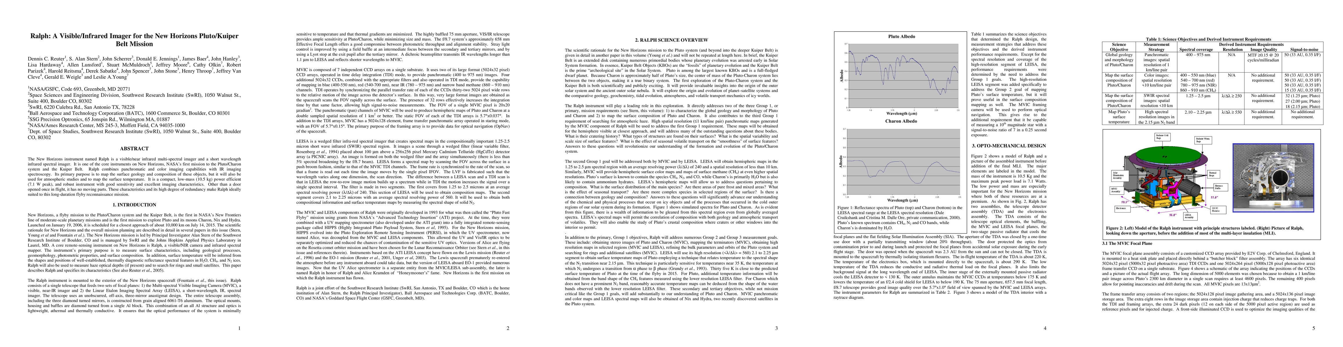 The Ralph instrument on the New Horizons mission is a compact, efficient visible/infrared imager designed to map the geology, composition, and surface temperature of Pluto/Charon and Kuiper Belt objects, featuring advanced imaging spectroscopy and minimal moving parts. Its robust design and high redundancy make it ideal for the mission's long-duration reconnaissance objectives.