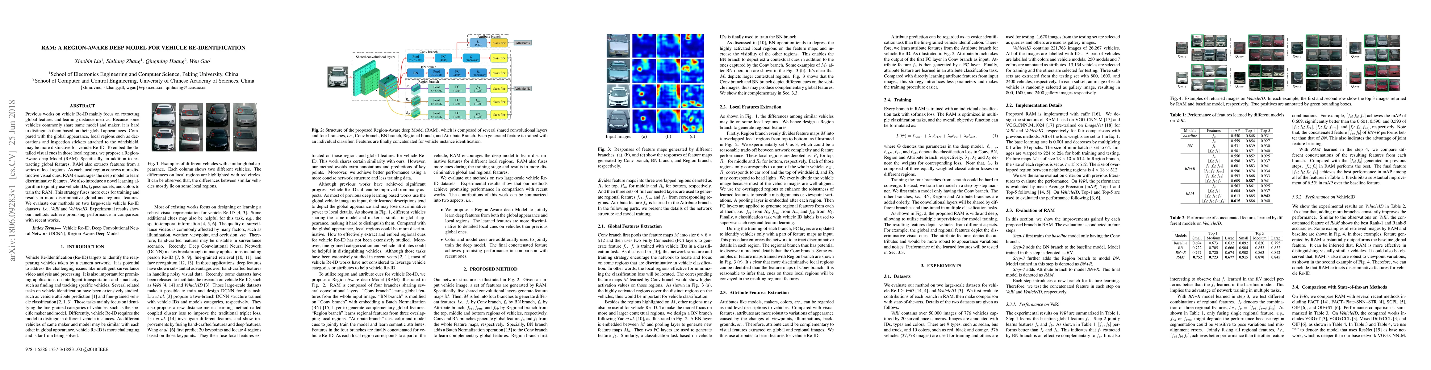 A new deep model called RAM is proposed to improve vehicle re-identification accuracy by extracting features from local regions such as decorations and inspection stickers, in addition to global features.