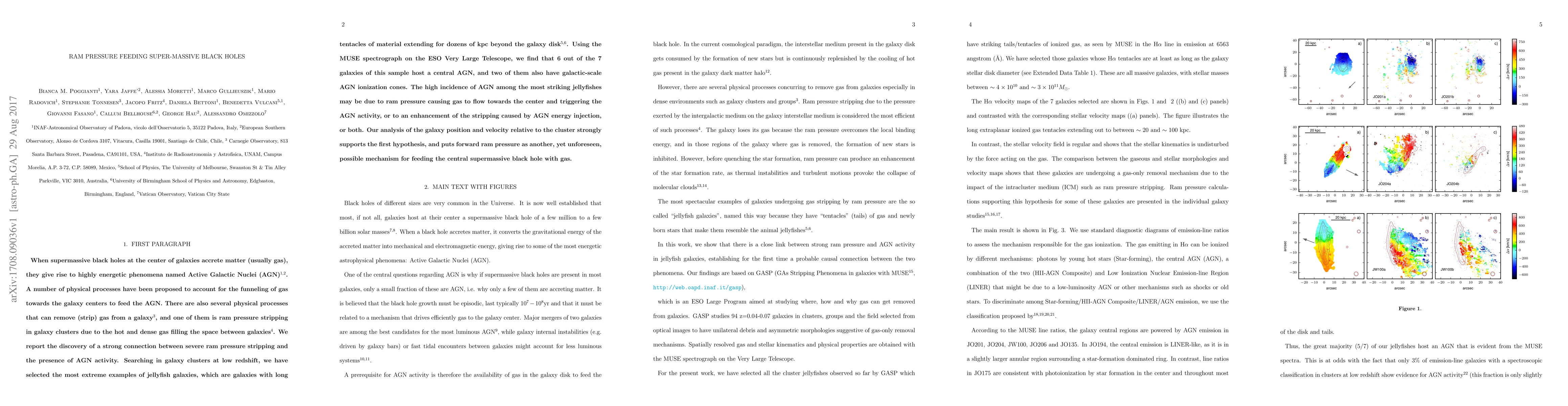 When supermassive black holes at the center of galaxies accrete matter (usually gas), they give rise to highly energetic phenomena named Active Galactic Nuclei (AGN). A number of physical processes have been proposed to account for the funneling of gas towards the galaxy centers to feed the AGN. There are also several physical processes that can strip gas from a galaxy, and one of them is ram pressure stripping in galaxy clusters due to the hot and dense gas filling the space between galaxies. We report the discovery of a strong connection between severe ram pressure stripping and the presence of AGN activity. Searching in galaxy clusters at low redshift, we have selected the most extreme examples of jellyfish galaxies, which are galaxies with long tentacles of material extending for dozens of kpc beyond the galaxy disk. Using the MUSE spectrograph on the ESO Very Large Telescope, we find that 6 out of the 7 galaxies of this sample host a central AGN, and two of them also have galactic-scale AGN ionization cones. The high incidence of AGN among the most striking jellyfishes may be due to ram pressure causing gas to flow towards the center and triggering the AGN activity, or to an enhancement of the stripping caused by AGN energy injection, or both. Our analysis of the galaxy position and velocity relative to the cluster strongly supports the first hypothesis, and puts forward ram pressure as another, yet unforeseen, possible mechanism for feeding the central supermassive black hole with gas.