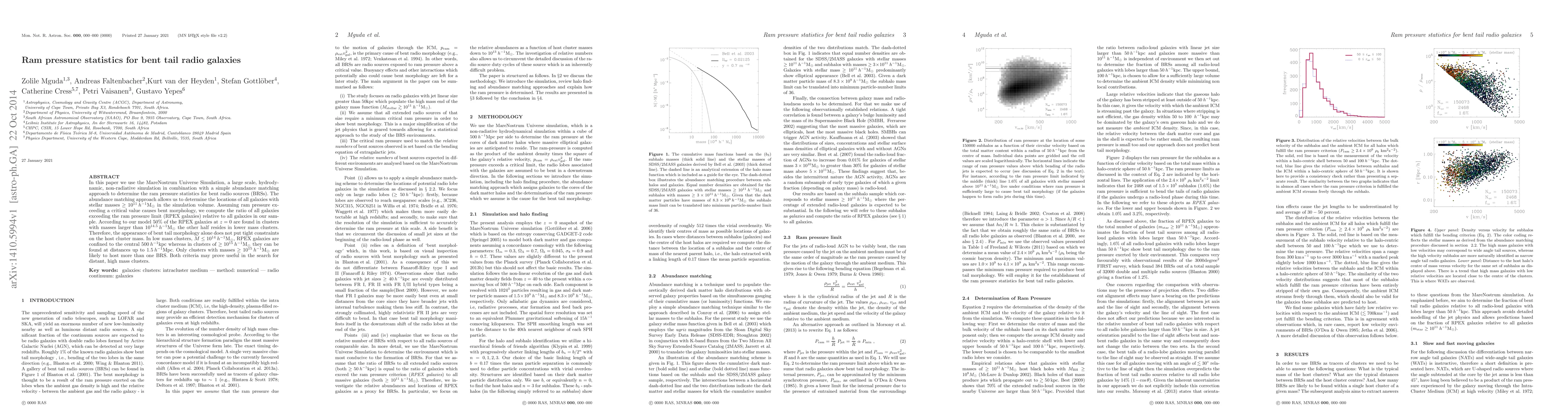 In this paper we use the MareNostrum Universe Simulation, a large scale, hydrodynamic, non-radiative simulation in combination with a simple abundance matching approach to determine the ram pressure statistics for bent radio sources (BRSs). The abundance matching approach allows us to determine the locations of all galaxies with stellar masses $> 10^{11} MSol$ in the simulation volume. Assuming ram pressure exceeding a critical value causes bent morphology, we compute the ratio of all galaxies exceeding the ram pressure limit (RPEX galaxies) relative to all galaxies in our sample. According to our model 50% of the RPEX galaxies at $z = 0$ are found in clusters with masses larger than $10^{14.5}MSol$ the other half resides in lower mass clusters. Therefore, the appearance of bent tail morphology alone does not put tight constraints on the host cluster mass. In low mass clusters, $M < 10^{14}MSol$, RPEX galaxies are confined to the central 500 kpc whereas in clusters of $> 10^{15}Msol$ they can be found at distances up to 1.5Mpc. Only clusters with masses $> 10^{15}MSol $ are likely to host more than one BRS. Both criteria may prove useful in the search for distant, high mass clusters.