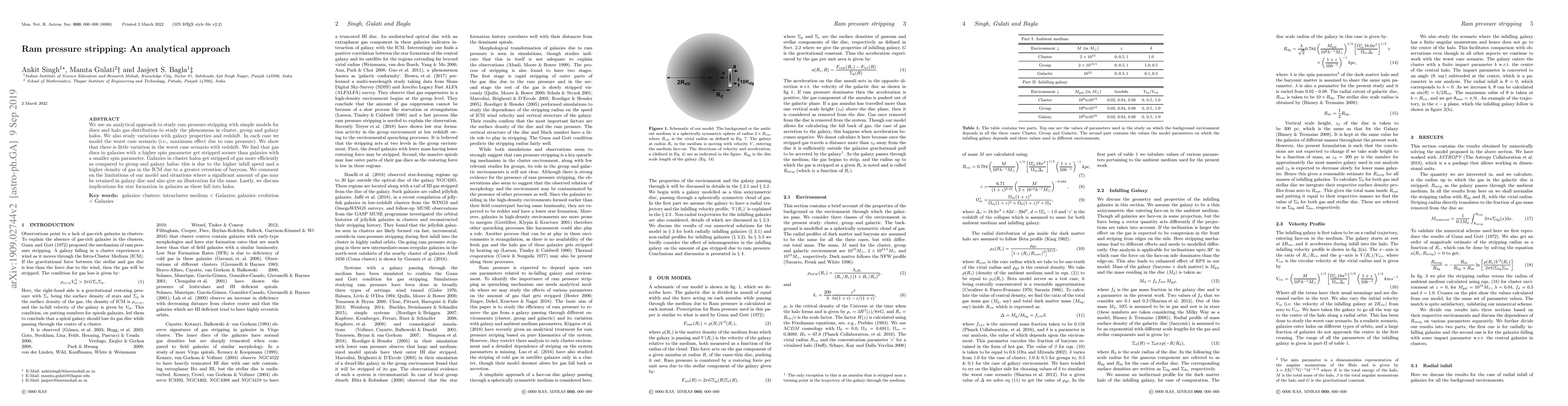 We use an analytical approach to study ram pressure stripping with simple models for discs and halo gas distribution to study the phenomena in cluster, group and galaxy halos. We also study variations with galaxy properties and redshift. In each case we model the worst case scenario (i.e., maximum effect due to ram pressure). We show that there is little variation in the worst case scenario with redshift. We find that gas discs in galaxies with a higher spin parameter get stripped sooner than galaxies with a smaller spin parameter. Galaxies in cluster halos get stripped of gas more effciently as compared to group and galaxy halos: this is due to the higher infall speed and a higher density of gas in the ICM due to a greater retention of baryons. We comment on the limitations of our model and situations where a signiffcant amount of gas may be retained in galaxy disc and also give an illustration for the same. Lastly, we discuss implications for star formation in galaxies as these fall into halos.