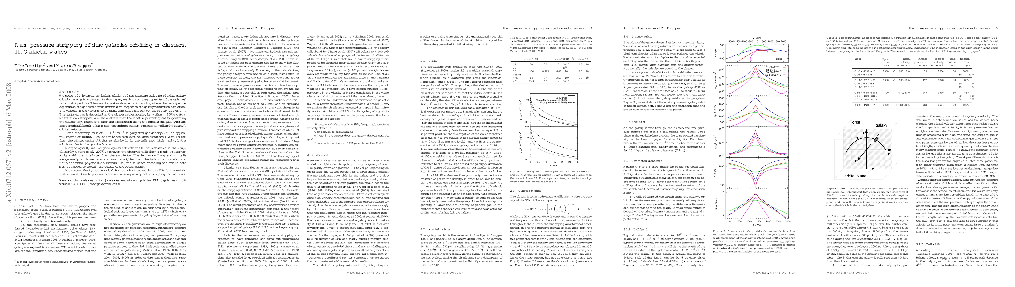 Simulations show that galaxies in clusters experience long tails of stripped gas, with flaring widths depending on the galaxy's direction of motion, and velocities of up to 100 km/s.