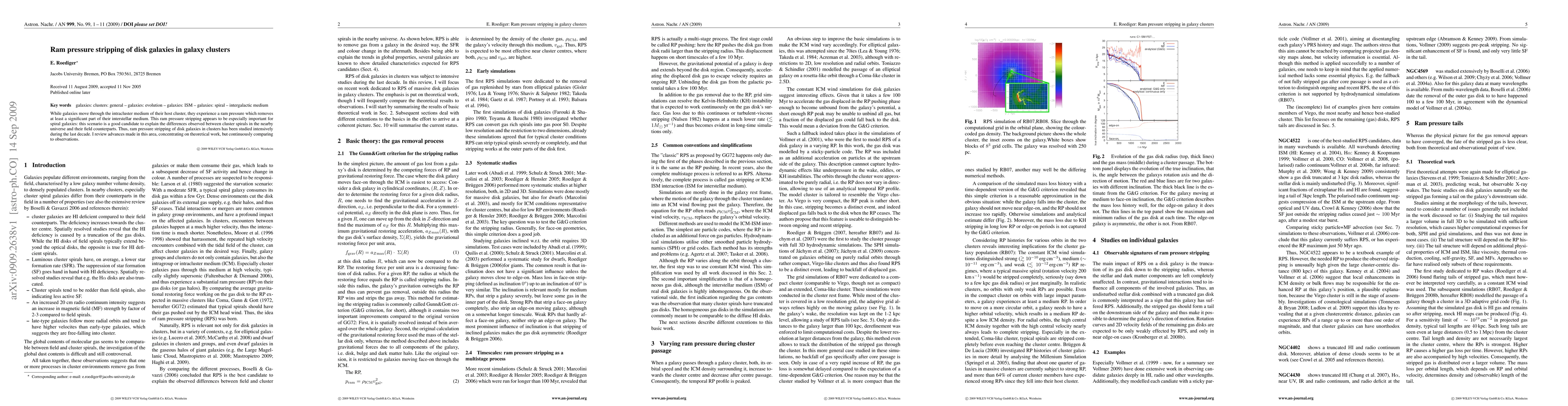 While galaxies move through the intracluster medium of their host cluster, they experience a ram pressure which removes at least a significant part of their interstellar medium. This ram pressure stripping appears to be especially important for spiral galaxies: this scenario is a good candidate to explain the differences observed between cluster spirals in the nearby universe and their field counterparts. Thus, ram pressure stripping of disk galaxies in clusters has been studied intensively during the last decade. I review advances made in this area, concentrating on theoretical work, but continuously comparing to observations.