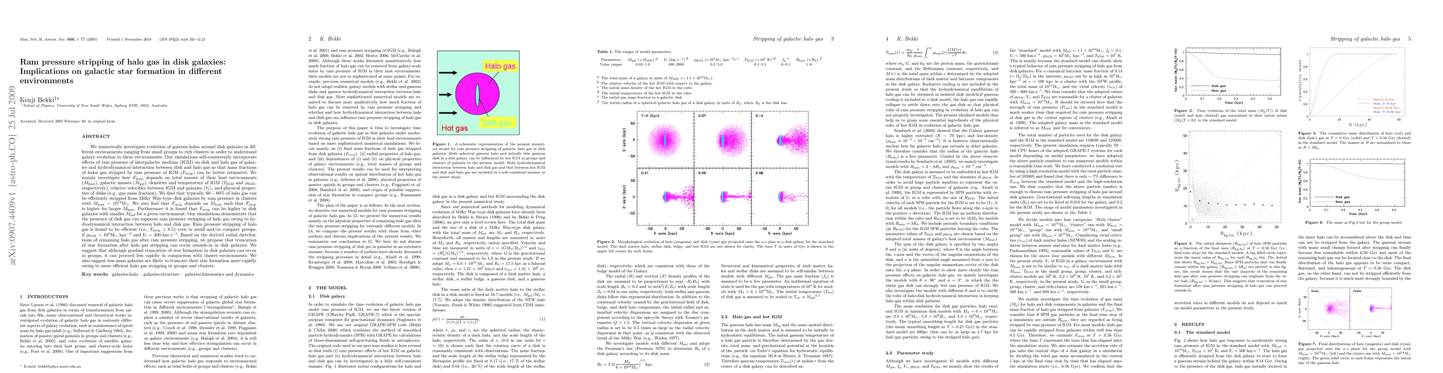 This paper investigates the impact of ram pressure stripping on gaseous halos around disk galaxies in various environments, finding that 60-80% of halo gas can be stripped in rich clusters. It concludes that stripping efficiency depends on the host environment's mass and galaxy properties, and suggests star formation may truncate outside-in after halo gas is stripped.