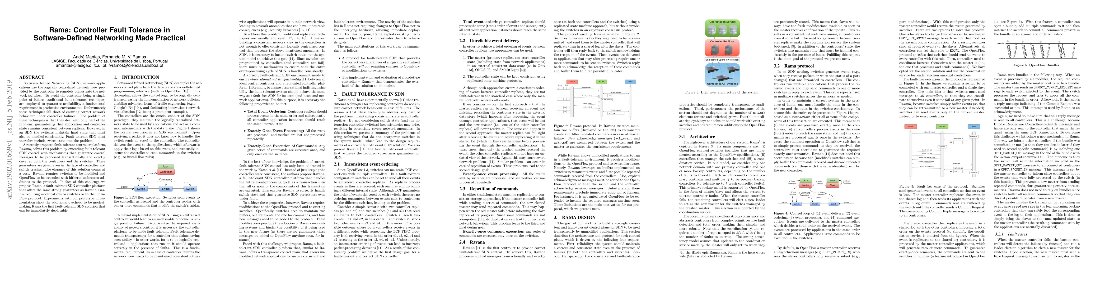 The paper proposes Rama, a fault-tolerant Software-Defined Networking (SDN) controller platform, which ensures consistent application and switch state without requiring modifications to switches or the OpenFlow protocol, contrasting with Ravana's more complex solution. Experimental results indicate Rama's overhead is modest, making it a deployable option for fault-tolerant SDN.