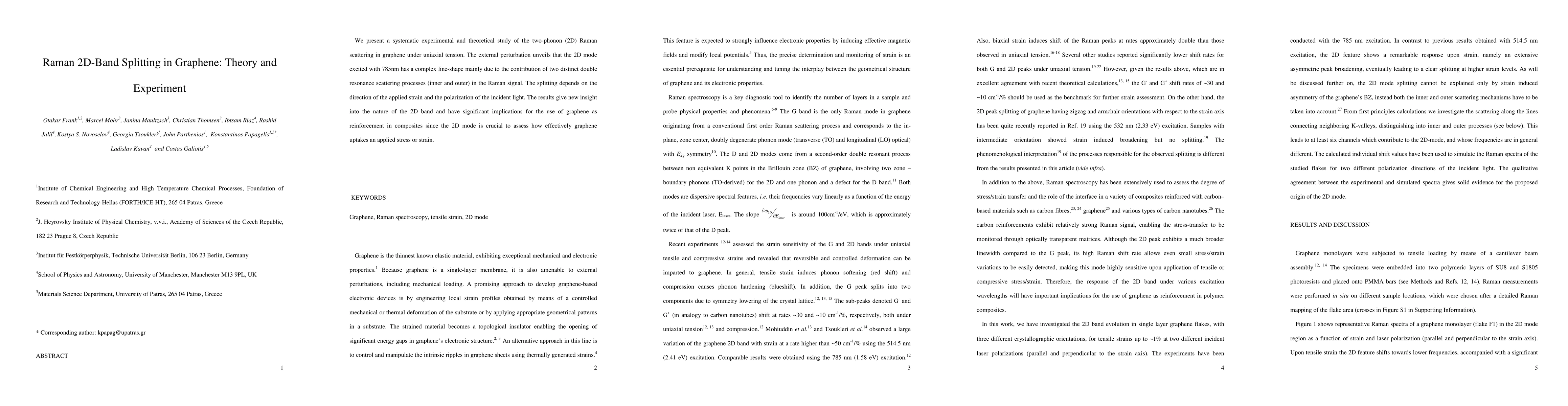 This study combines theoretical and experimental analysis of 2D Raman scattering in graphene under tension, revealing that the 2D mode's complex line-shape results from two distinct double resonance processes, which split depending on strain direction and light polarization, providing insights into graphene's stress absorption.